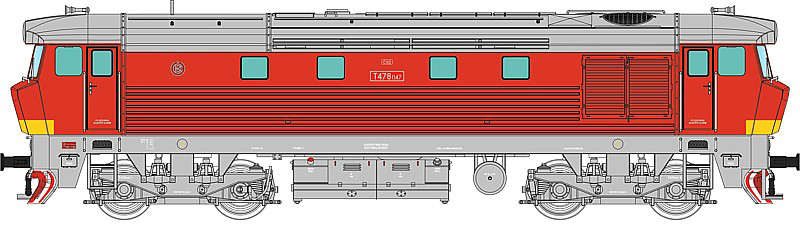 | dieselová lokomotiva červená s výstražným žlutým proužkem, šedá střecha |
