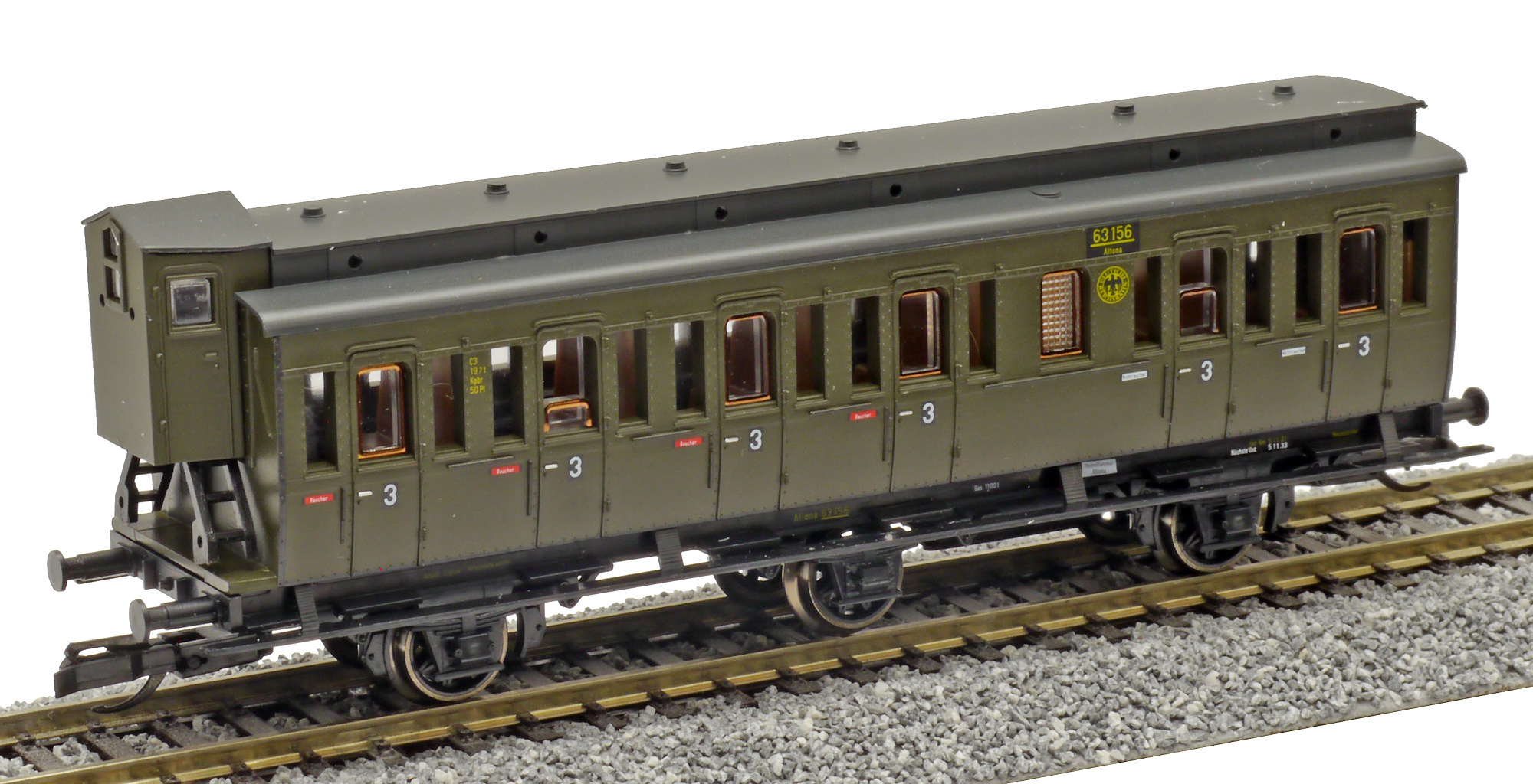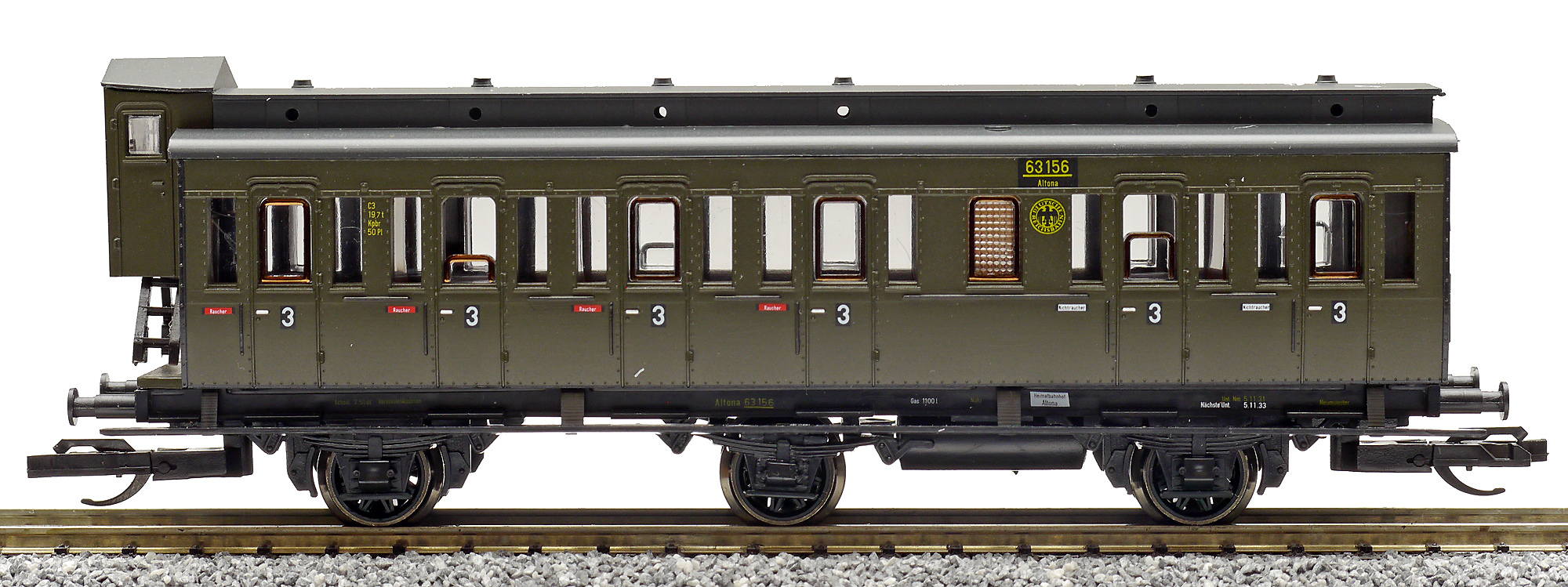 | oddílový osobní vůz tmavě zelený s černou střechou a s brzdařskou budkou 3. tř. |