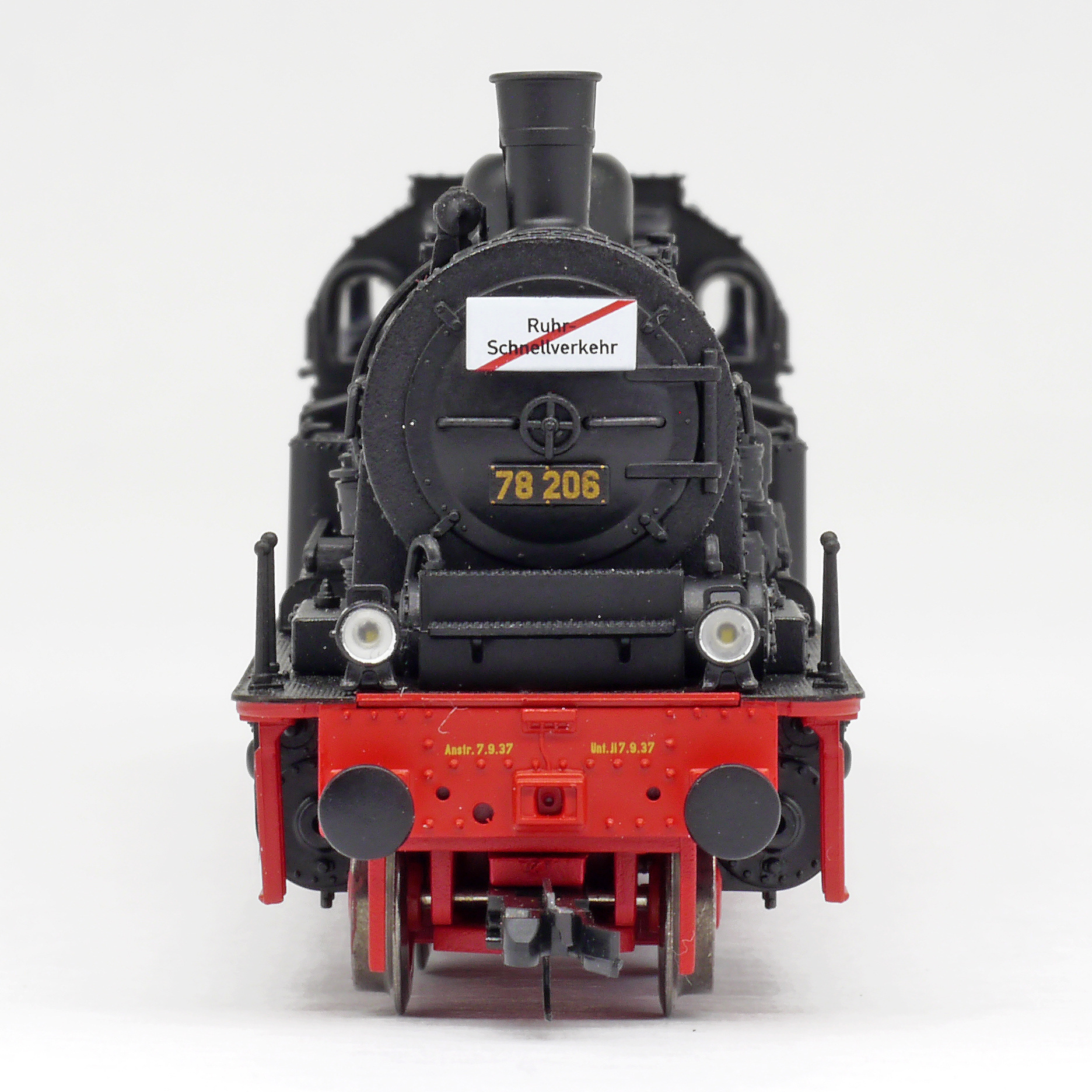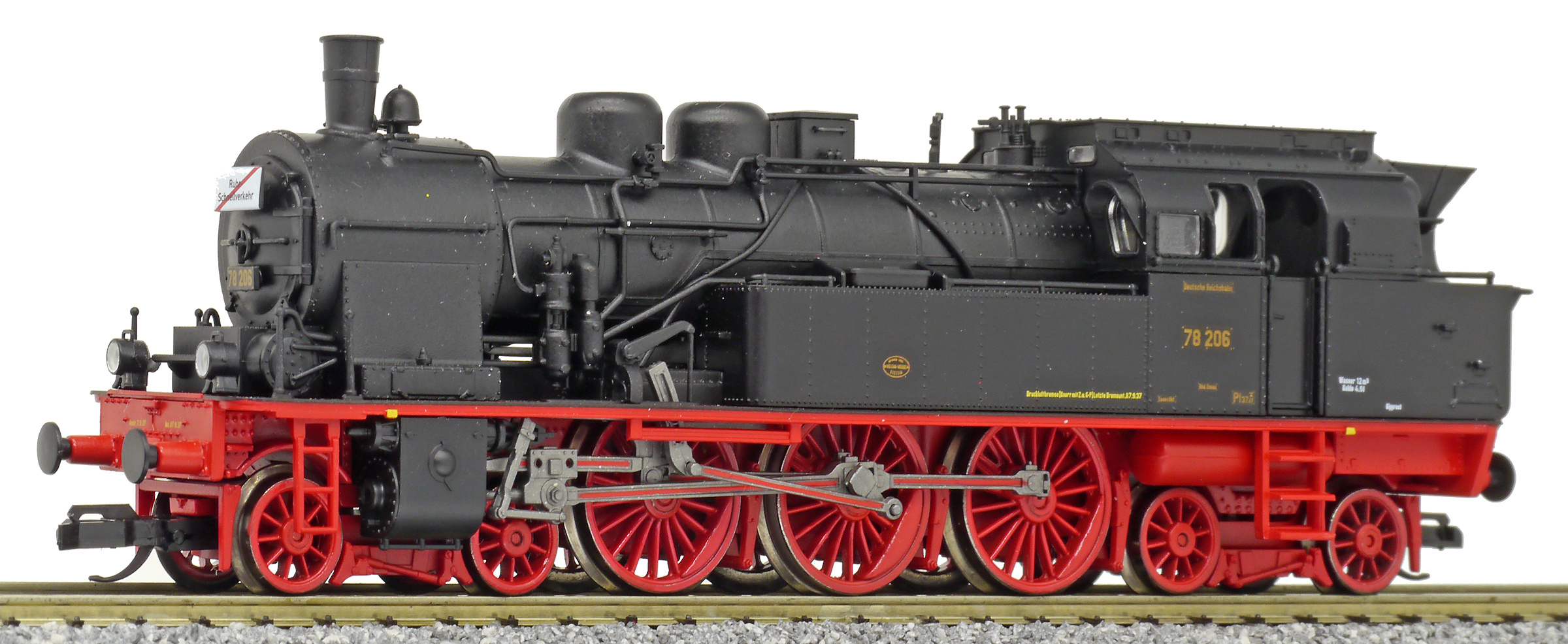 Popis   parní lokomotiva černá s červeným pojezdem „Ruhr-Schnellverkehr“