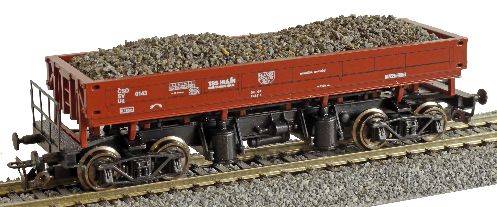 Popis   nákladní vůz oboustranně výsypný červený s černým pojezdem a nákladem