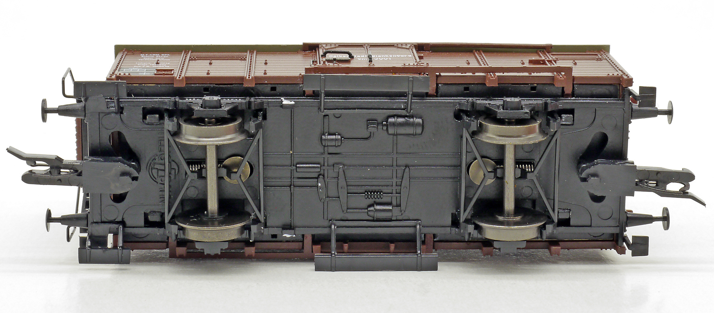 krytý nákladní vůz hnědý s černou střechou a s brzdařskou budkou