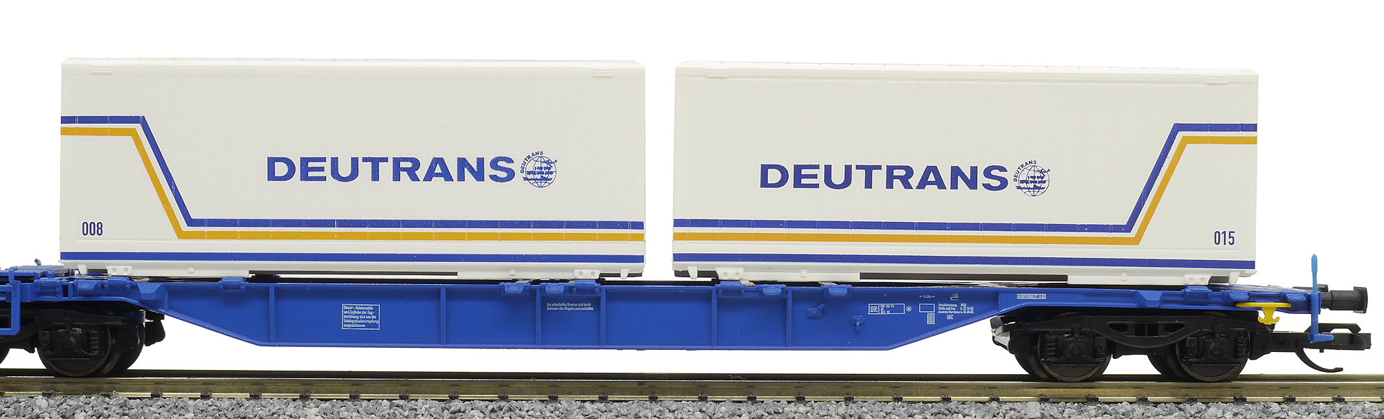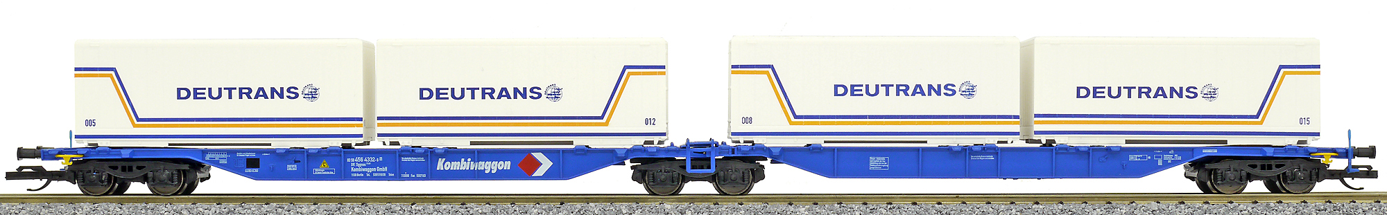 | dvoudílný kontejnerový vůz modrý „Kombiwaggon“ se čtyřmi kontejnery 20' „Deutrans“ |