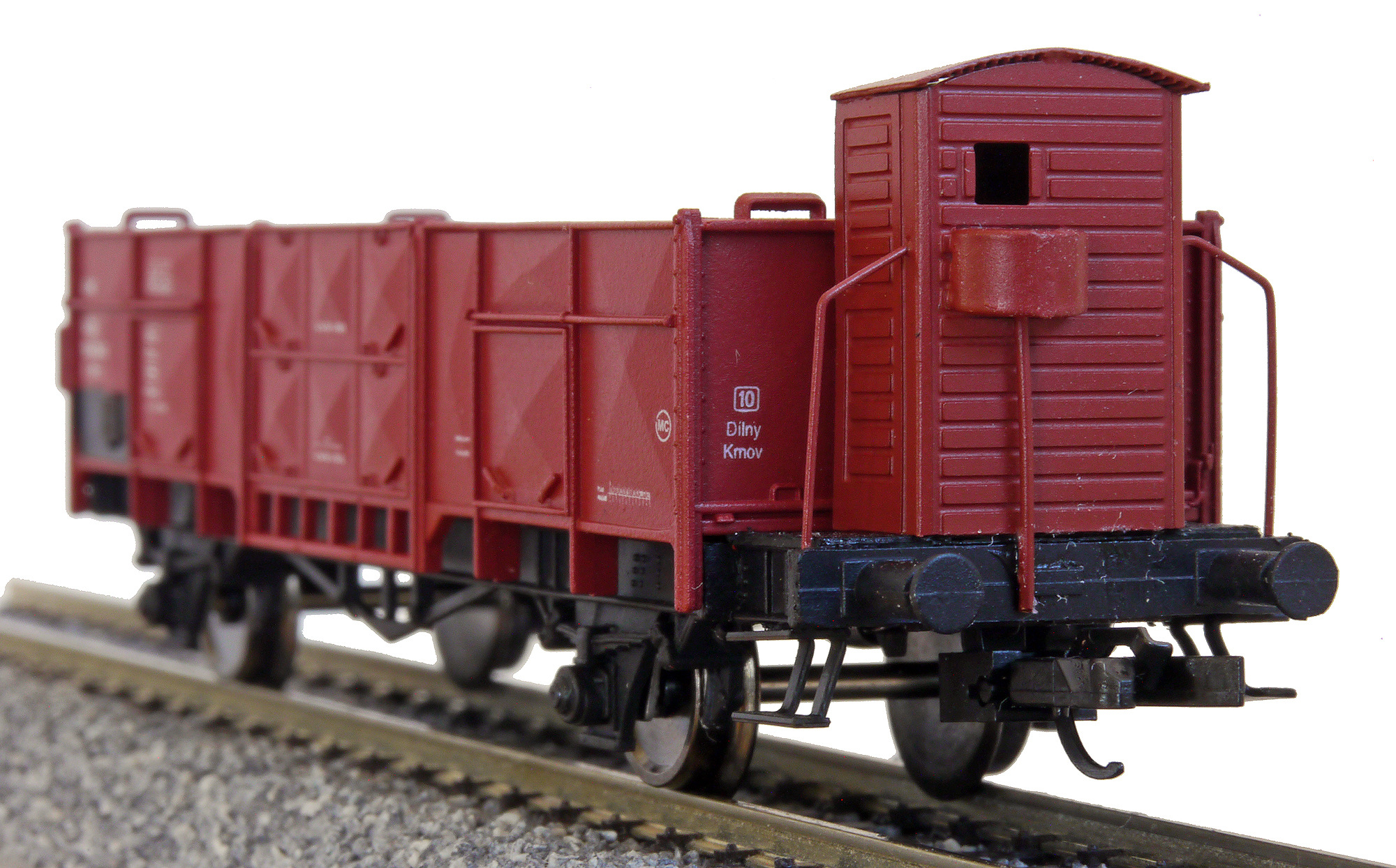 | otevřený nákladní vůz červenohnědý s brzdařskou budkou |