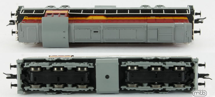 měřítko 1:120 - rozchod kolejí 12 mm osvětlení - 3 reflektory vpředu, 2 světla vzadu, přepínatelné podle směru jízdy 6 hnaných náprav 0 bandážovaných náprav kinematika krátkého spřáhla (KKK) podle normy NEM 358 digitální rozhraní podle NEM 662 s konektorem Next18 pojezd s kuličkovými ložisky 142 mm - celková délka modelu přes nárazníky 6 - celkový počet náprav nebo rozložení náprav 300 g - hmotnost brutto - model včetně prodejního obalu 205 g - hmotnost netto - pouze model