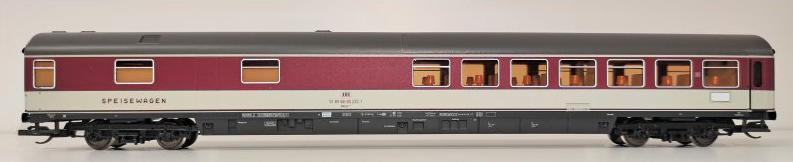 | jídelní vůz v barevném schematu „POP“ červenofialová-světle šedá |