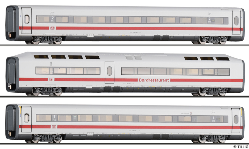 | třídílný set ICE-1 „Redesign“ z vložených vozů jídelního, 2. tř. a 1. t.ř. |
