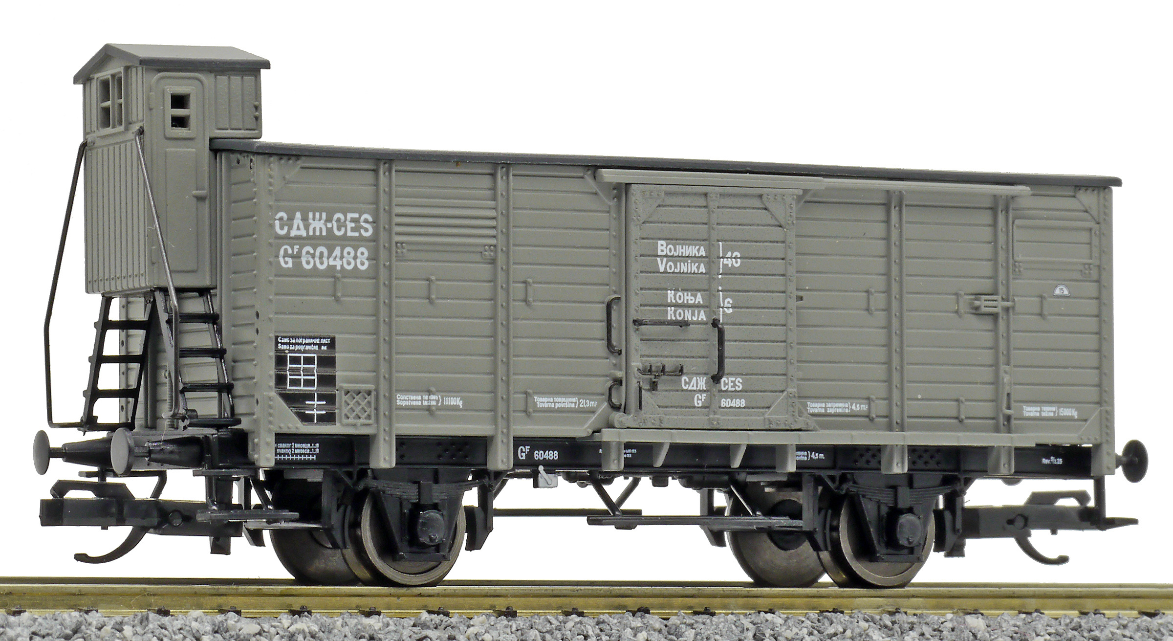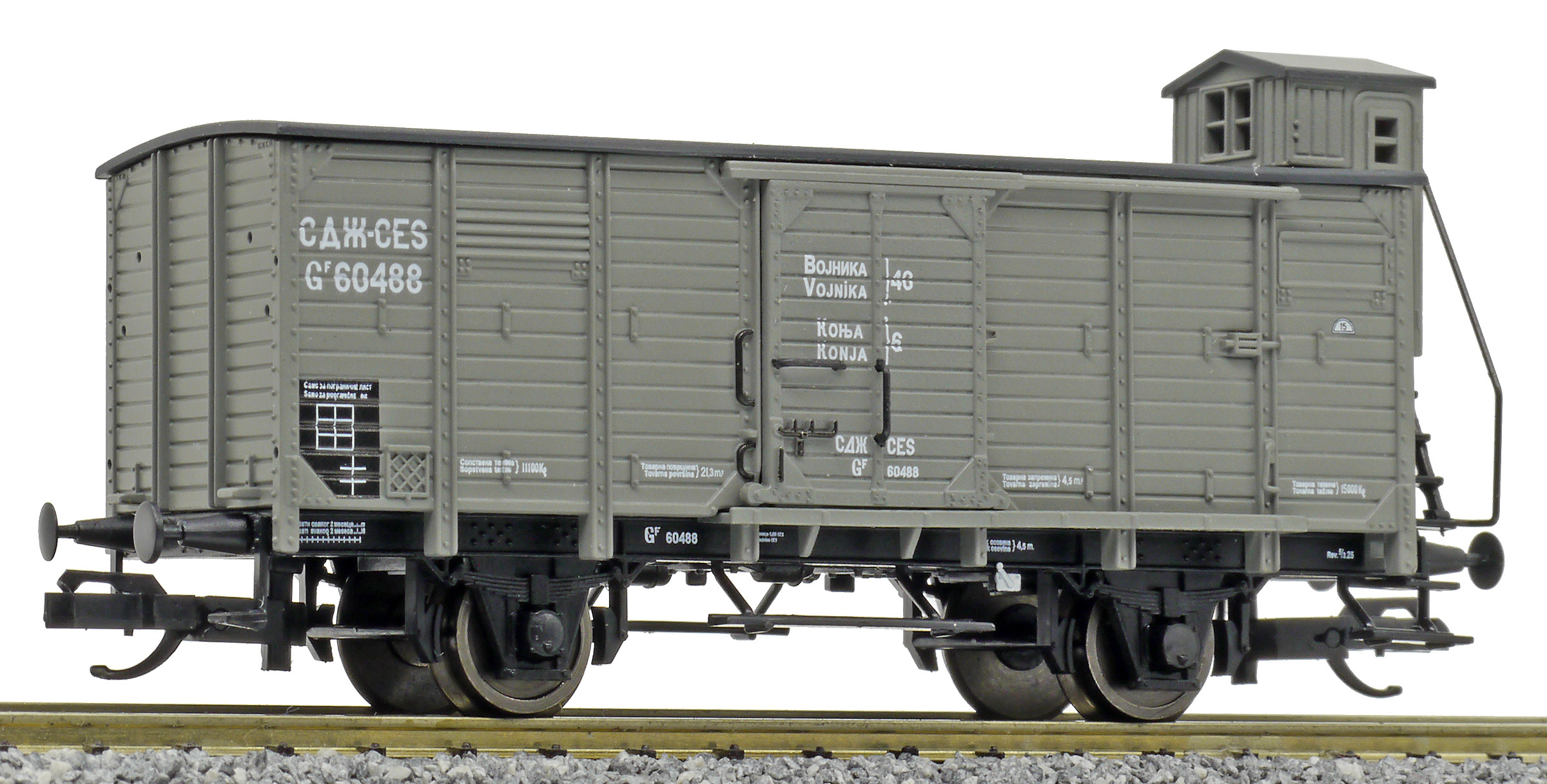 krytý nákladní vůz zelenošedý s černou střechou a s brzdařskou budkou