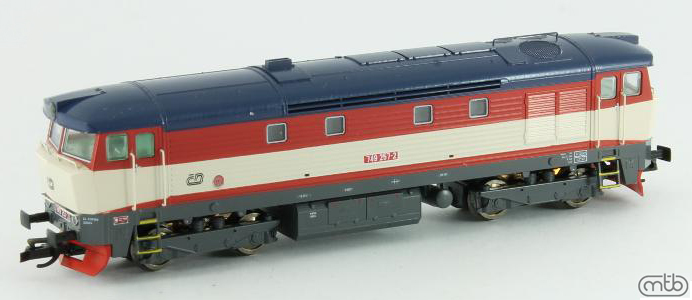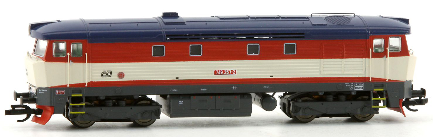 | dieselová lokomotiva červená-slonová kost, tmavě modrá střecha, tmavě šedý rám a podvozky |