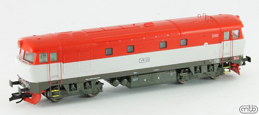 | dieselová lokomotiva červená-bílá, tmavě šedý rám a pojezd |
