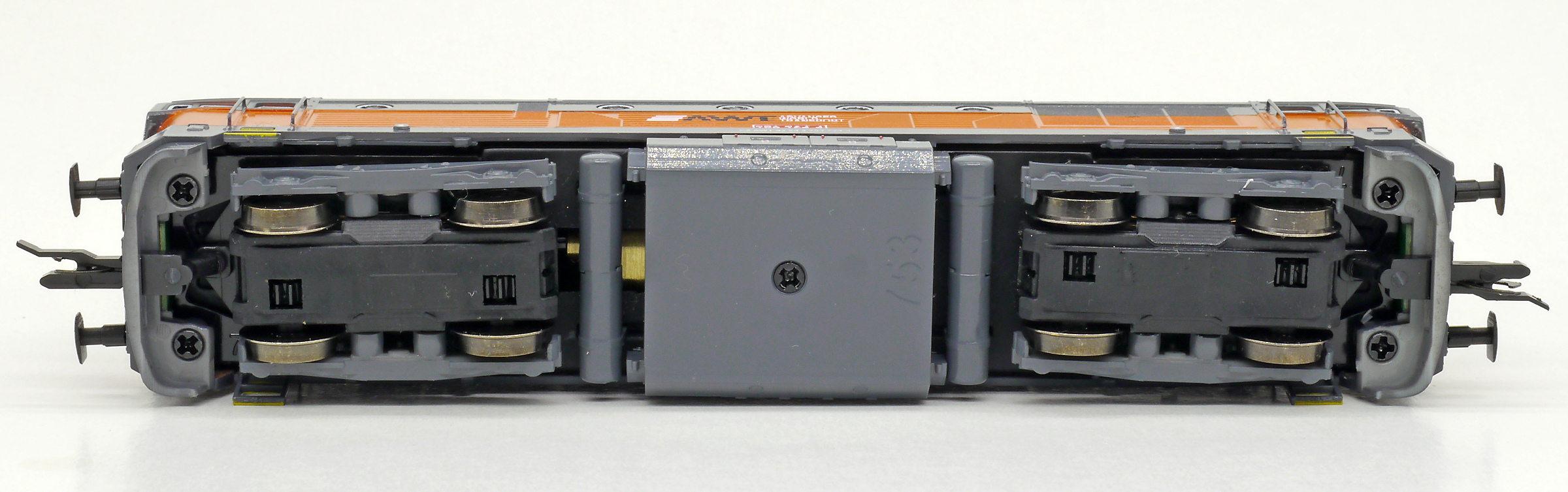 měřítko 1:120 - rozchod kolejí 12 mm osvětlení - 3 reflektory vpředu, 2 světla vzadu, přepínatelné podle směru jízdy 4 hnané nápravy 0 bandážovaných náprav kinematika krátkého spřáhla (KKK) podle normy NEM 358 digitální rozhraní podle NEM 658 s konektorem PluX16 setrvačník 137 mm - celková délka modelu přes nárazníky 4 - celkový počet náprav nebo rozložení náprav