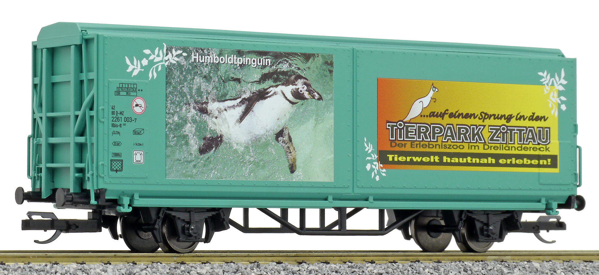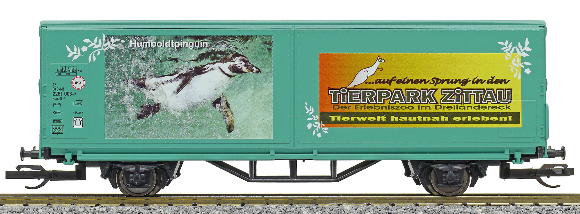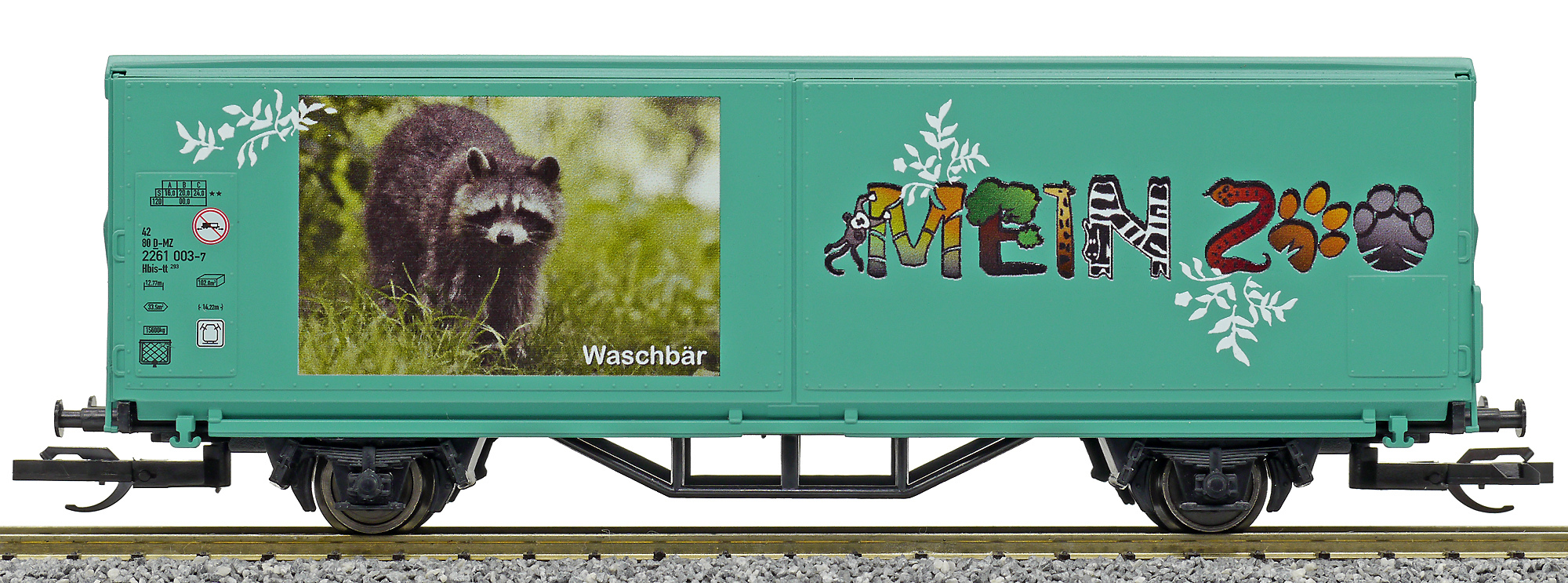 | krytý nákladní vůz s posuvnými stěnami a s reklamním potiskem „Mein Zoo” |