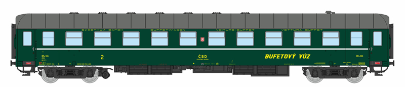 bufetový vůz zelený s šedou střechou 2. tř. se státním znakem, Praha