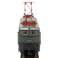 | elektrická lokomotiva tmavě zelená s černým rámem, stříbrná střecha, červené pantografy |