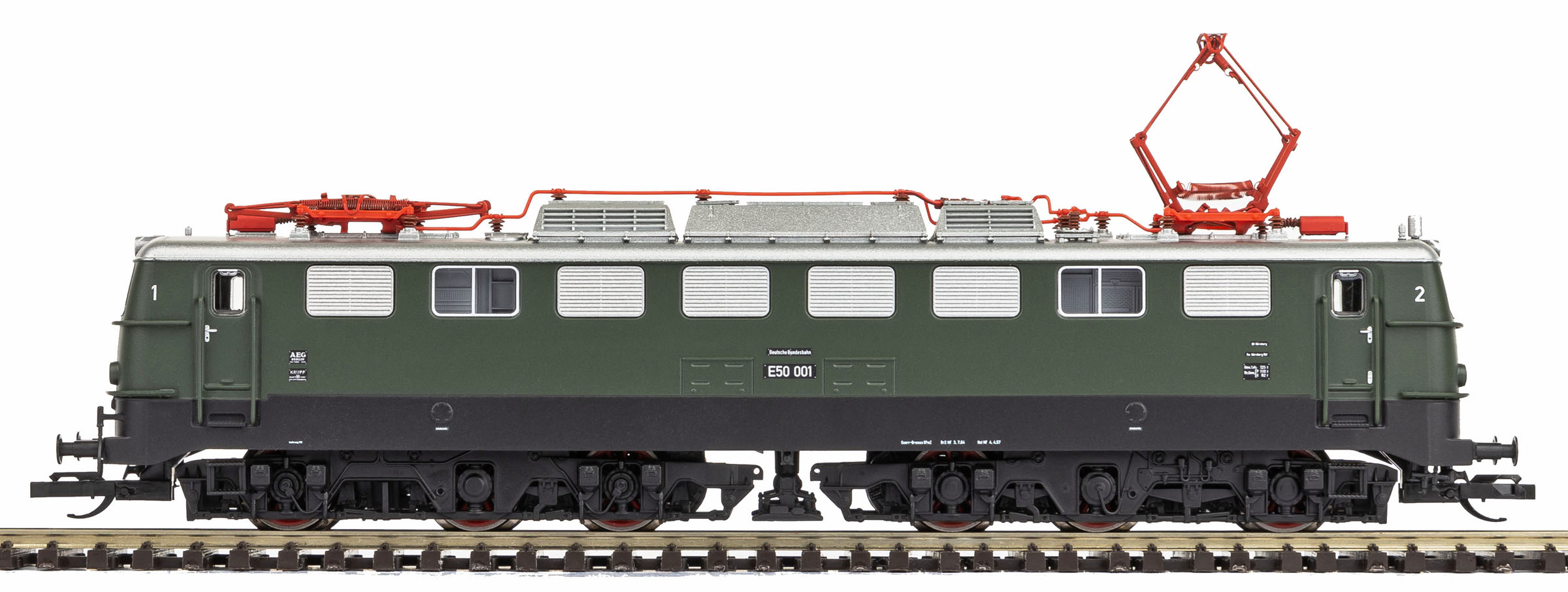 | elektrická lokomotiva tmavě zelená s černým rámem, stříbrná střecha, červené pantografy |