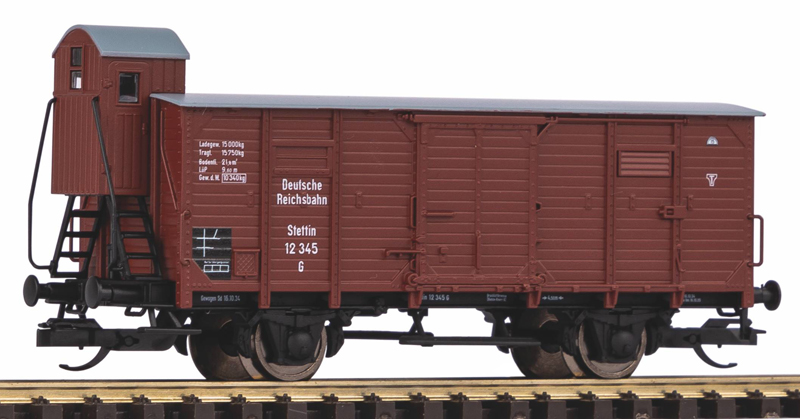 Popis   krytý nákladní vůz červenohnědý s šedou střechou a s brzdařskou budkou