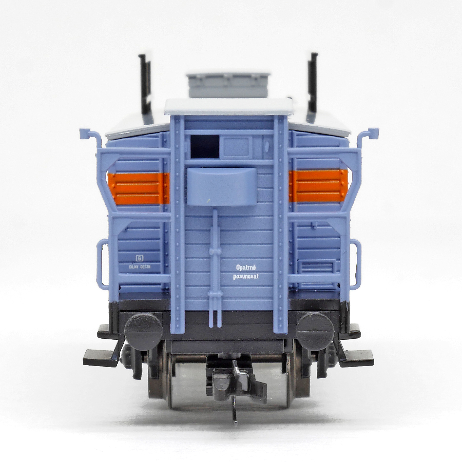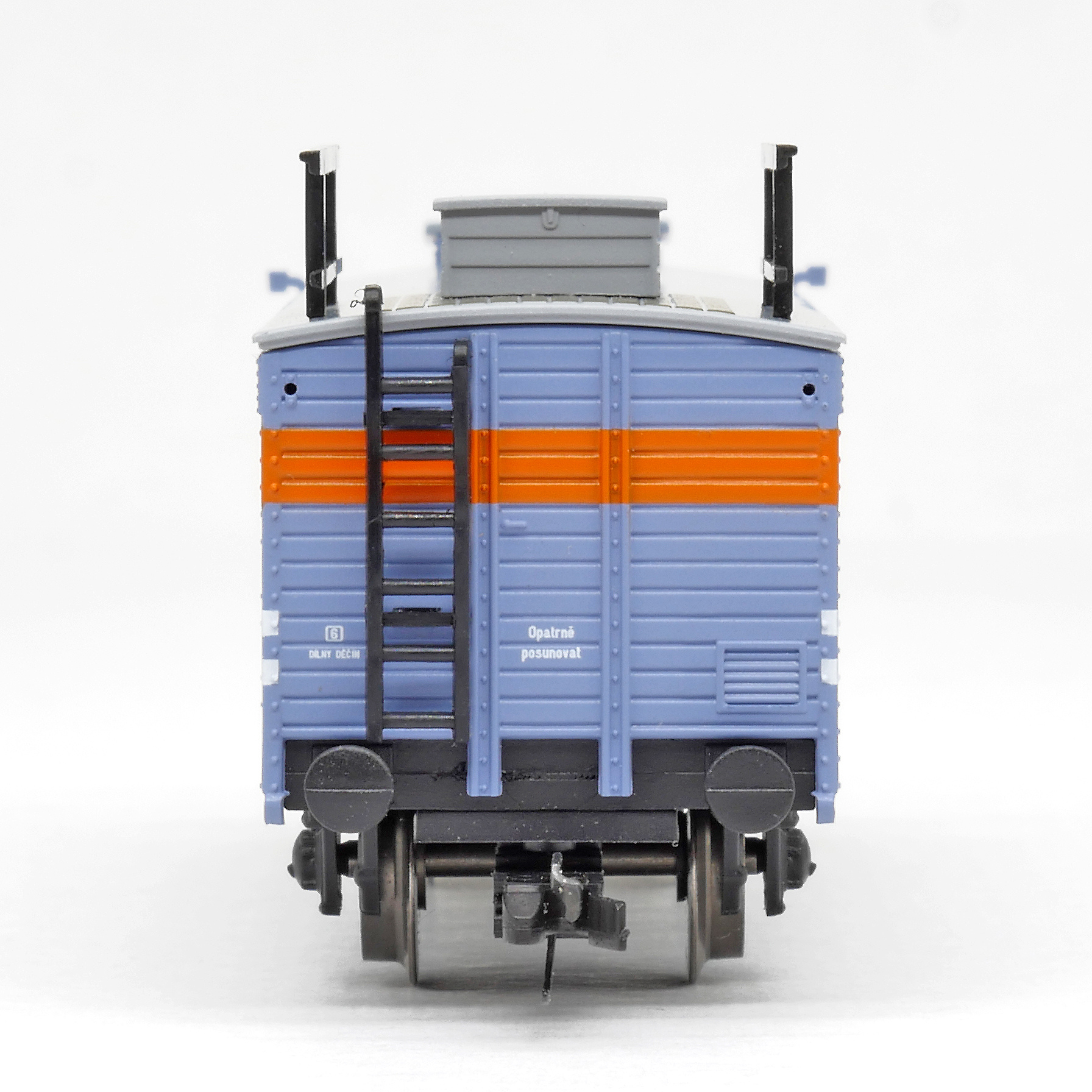 | krytý nákladní vůz na kapalný plyn modrý s šedou střechou a s brzdařskou budkou |