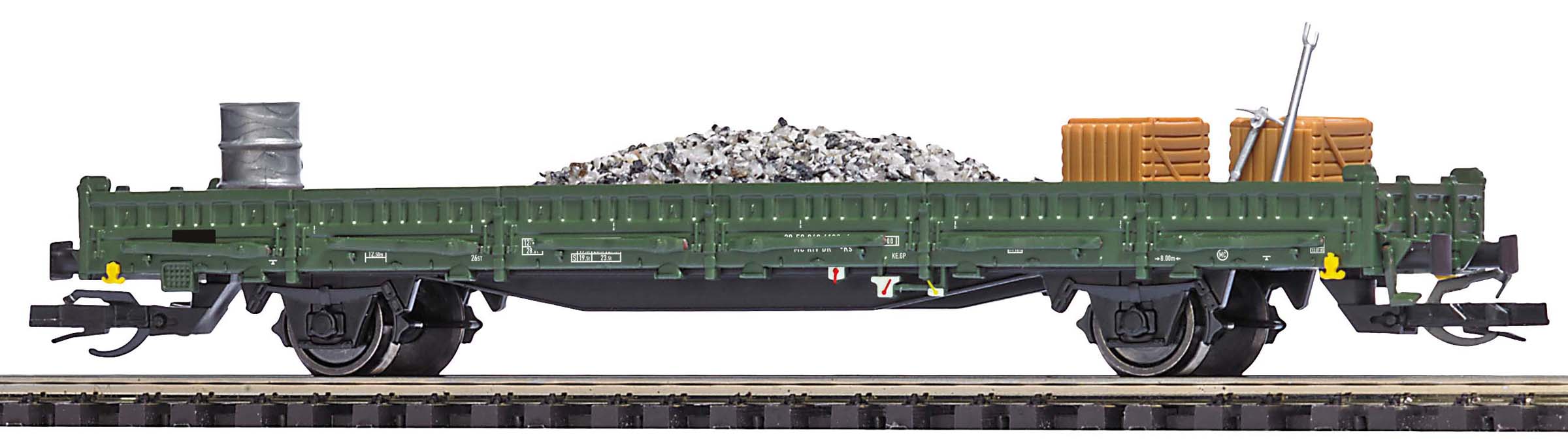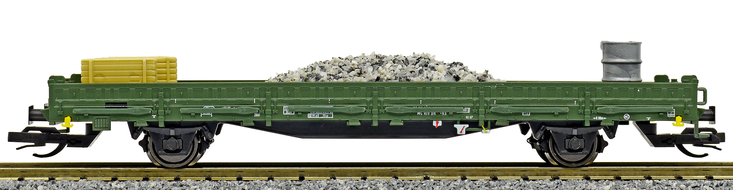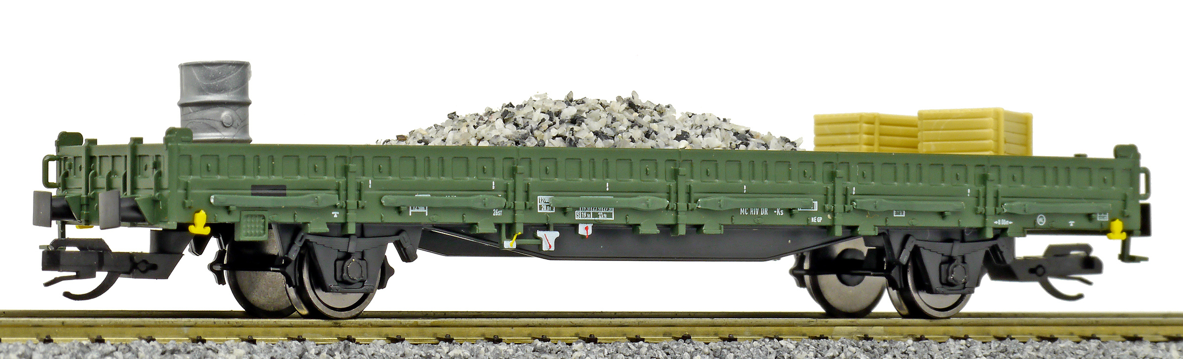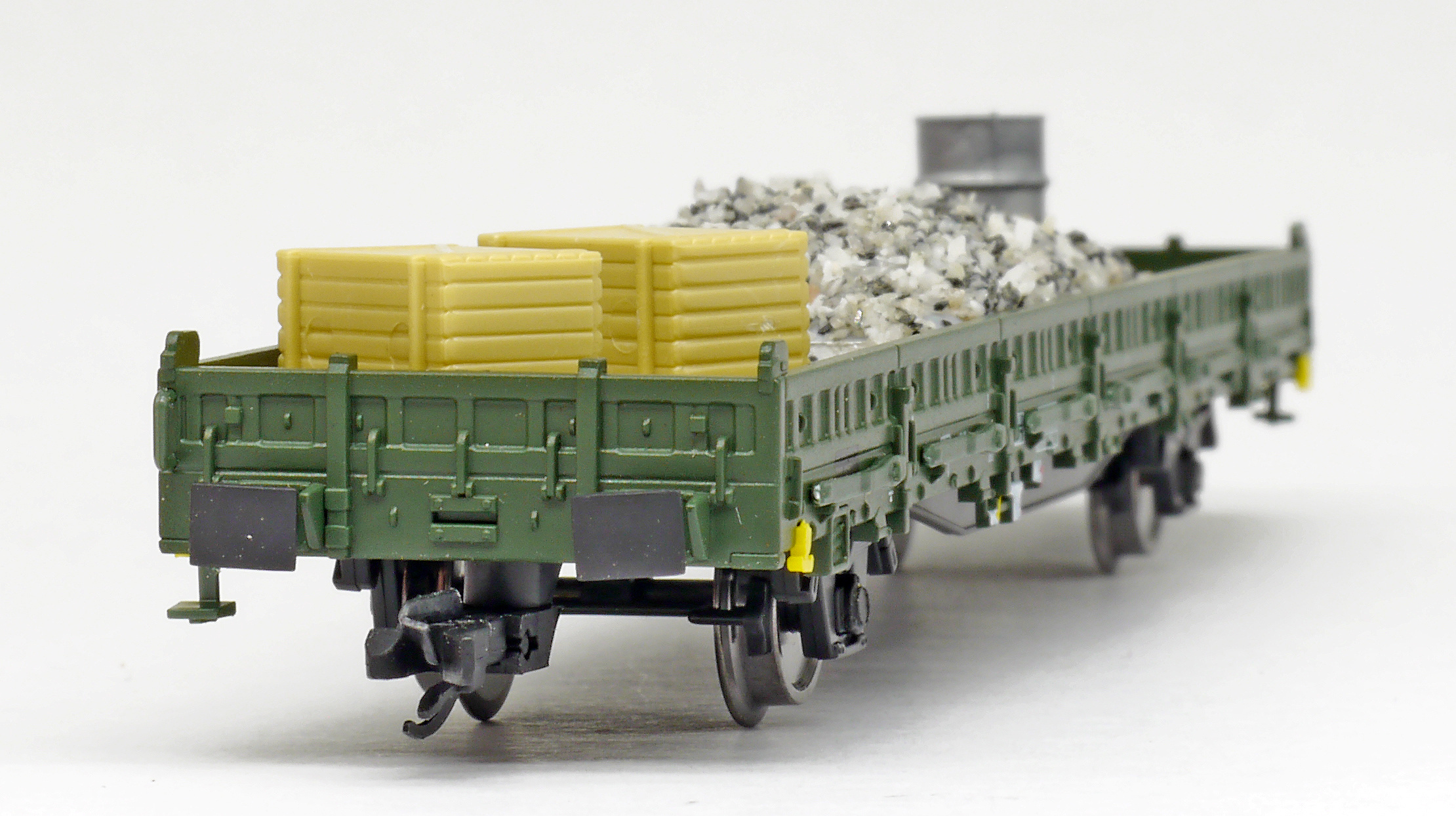 | nízkostěnný nákladní vůz zelený do pracovního vlaku s nákladem pracovního materiálu |