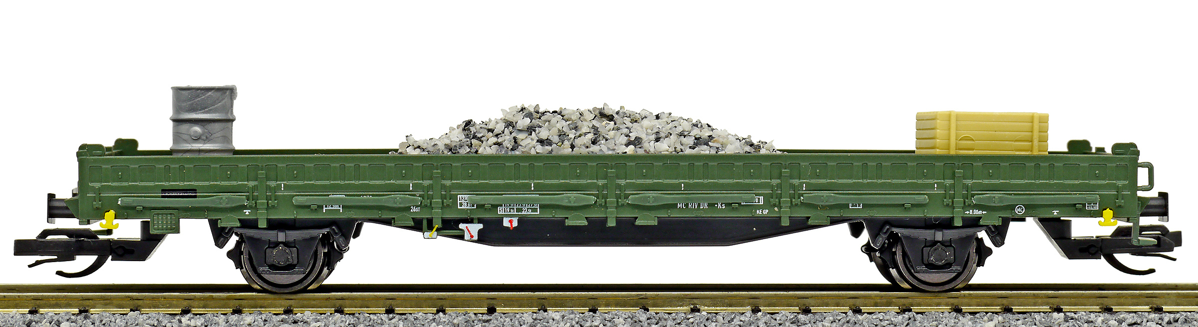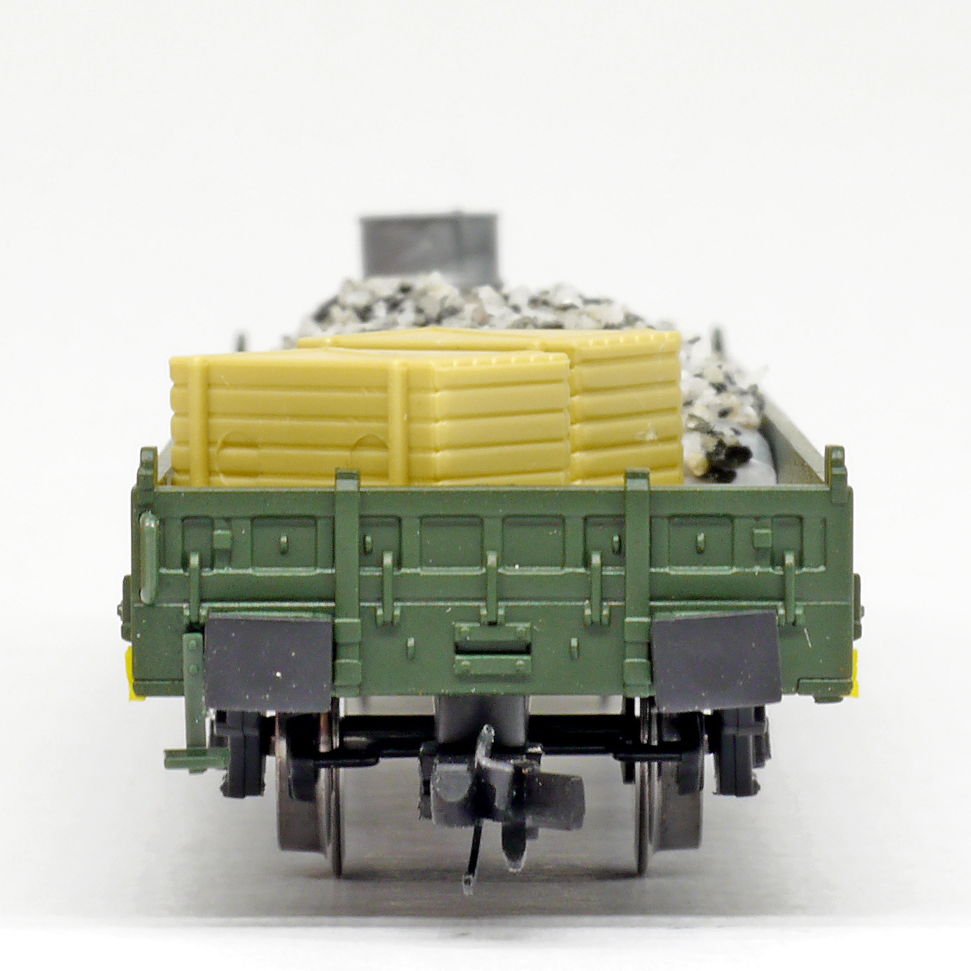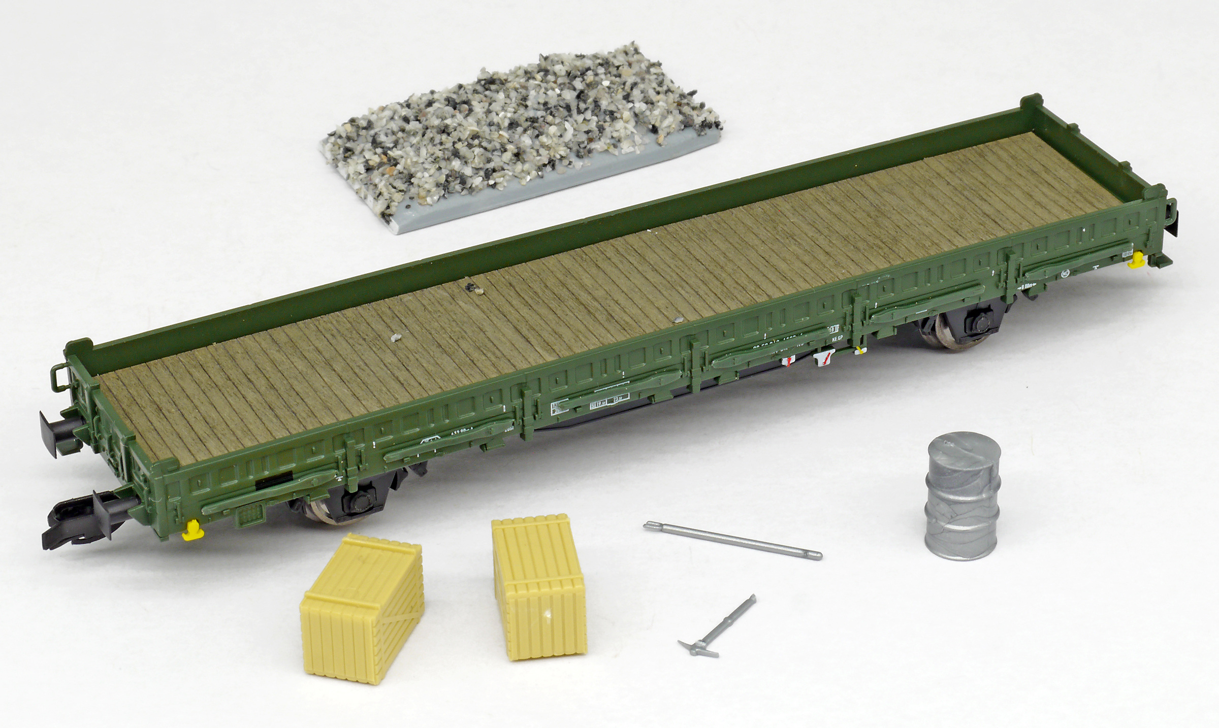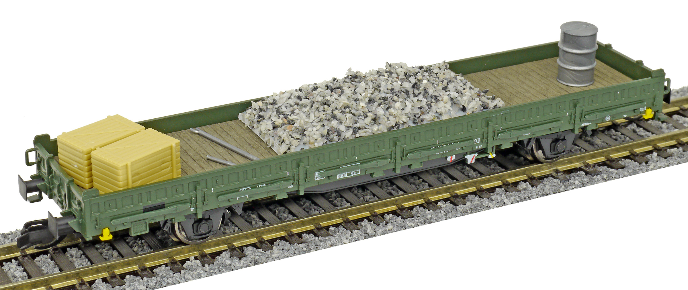 | nízkostěnný nákladní vůz zelený do pracovního vlaku s nákladem pracovního materiálu |