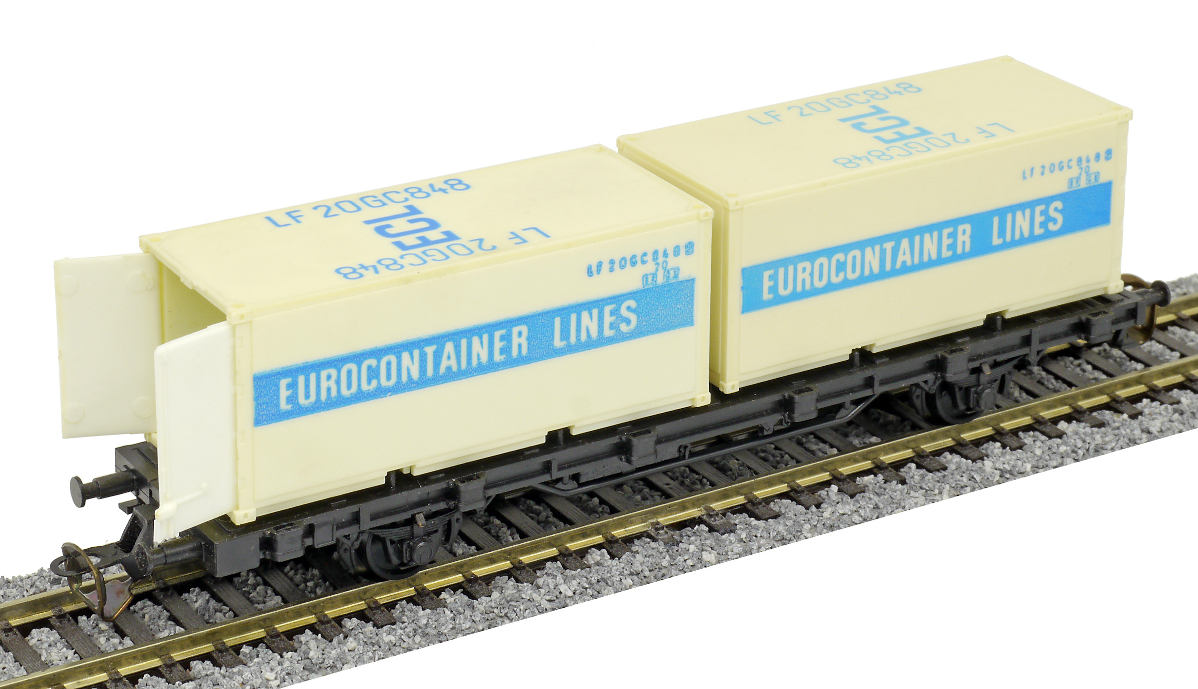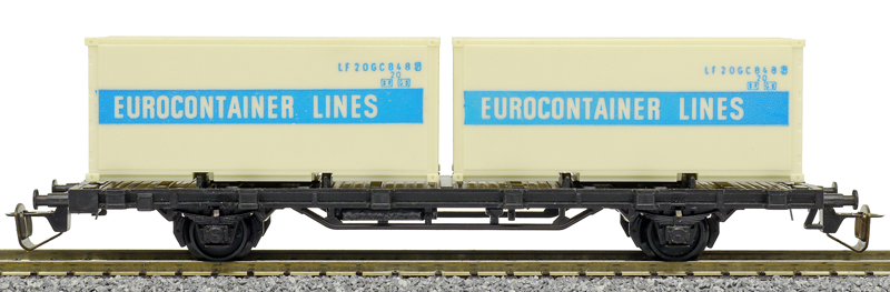 | nákladní plošinový vůz černý se dvěma 20' kontejnery „EUROCONTAINER LINES“ |