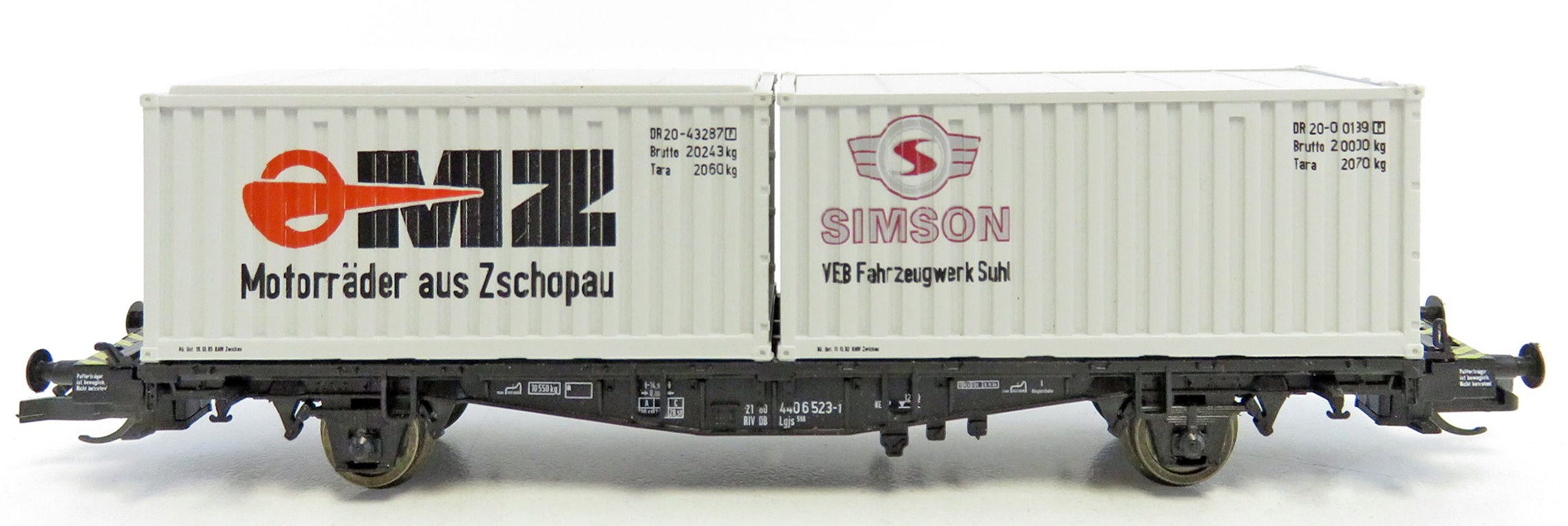 | plošinový nákladní vůz černý se dvěma kontejnery 20' „Simson“ a „MZ“ |
