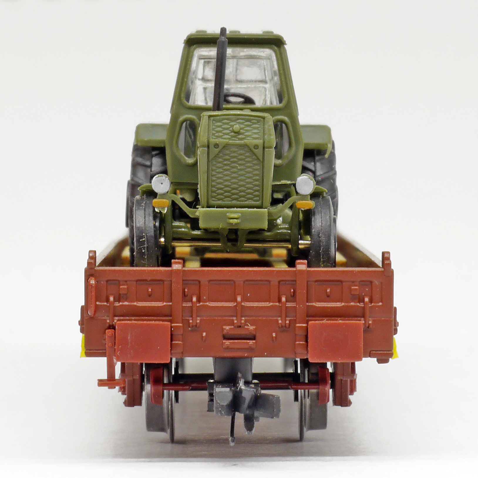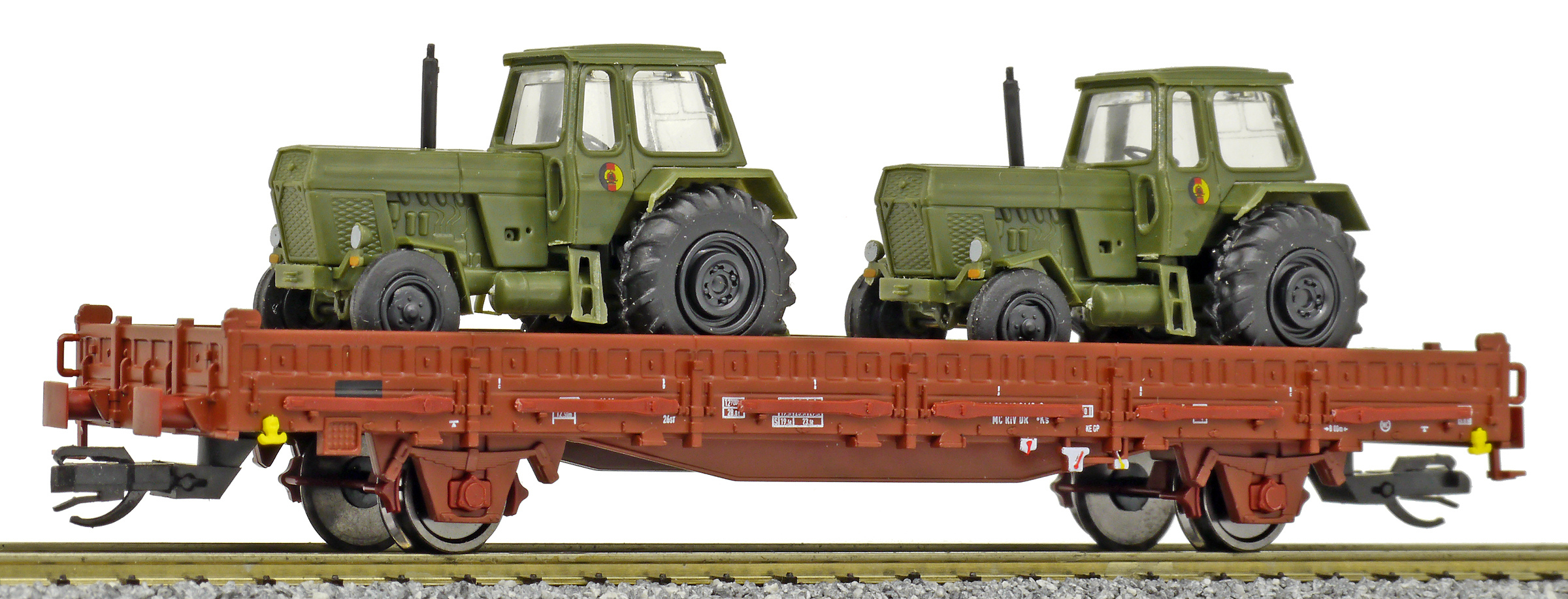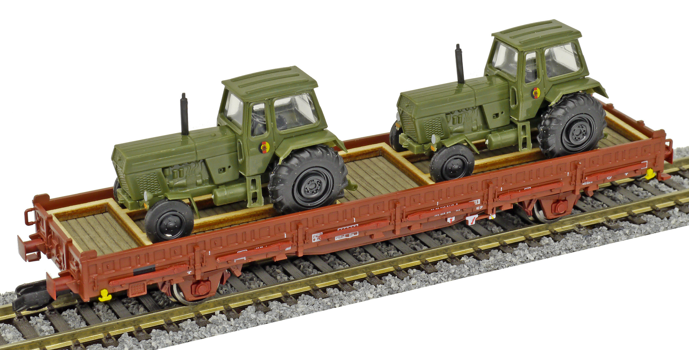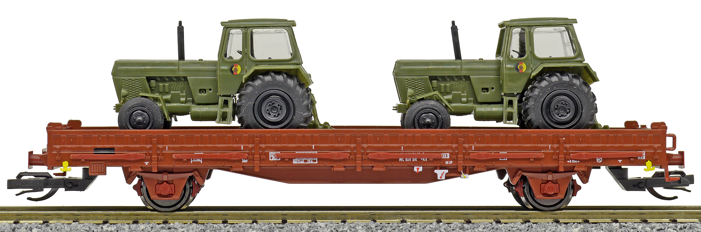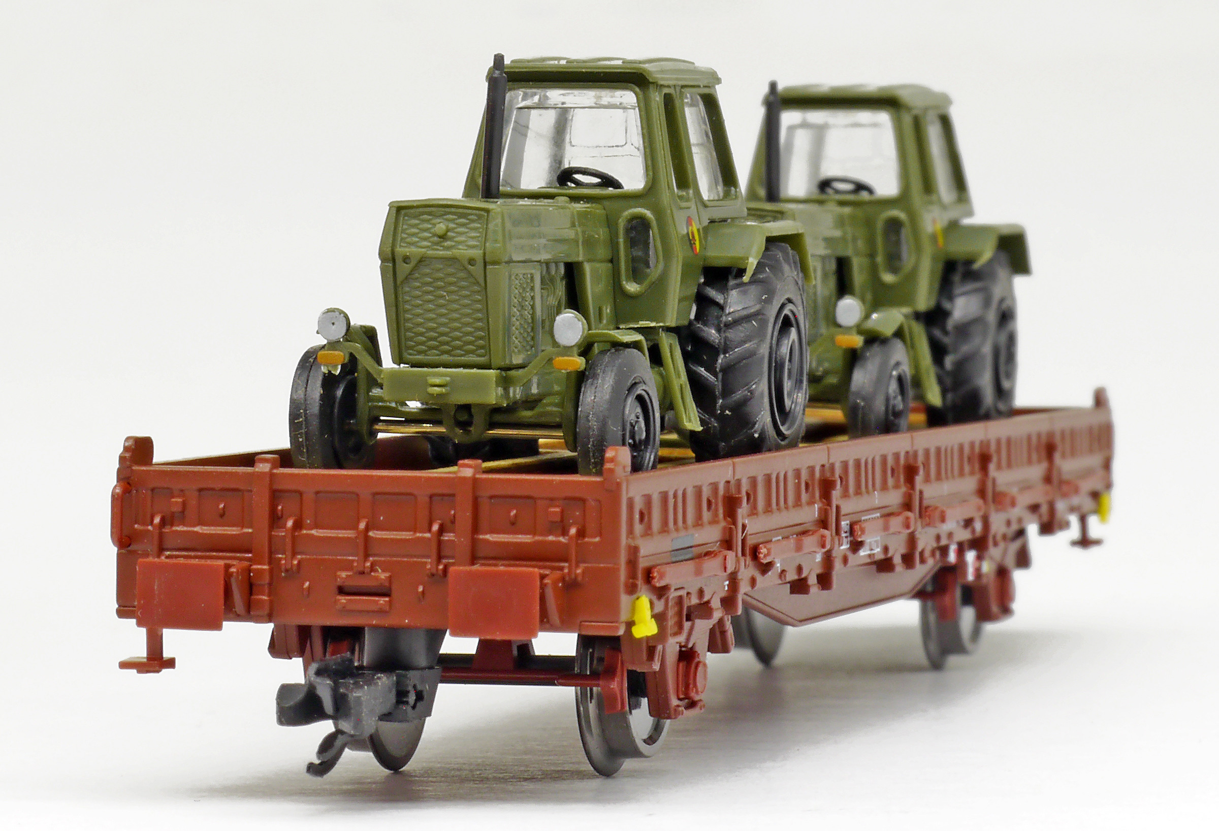 | nízkostěnný nákladní vůz červenohnědý s klanicemi s nákladem dvou traktorů ZT 300 NVA |