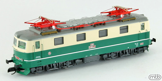 | elektrická lokomotiva zelená-slonová kost s šedou střechou |