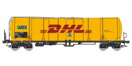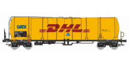 | set tří žlutých kotlových vozů s logem „DHL“ |