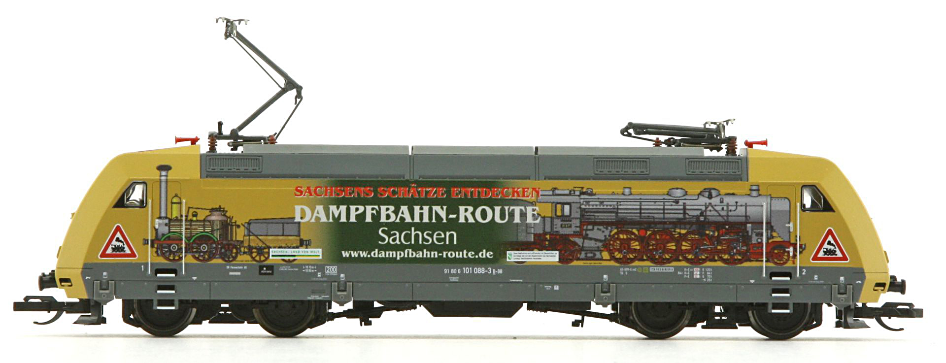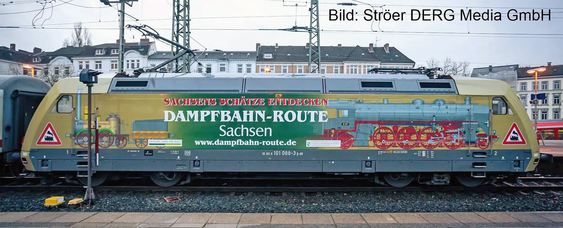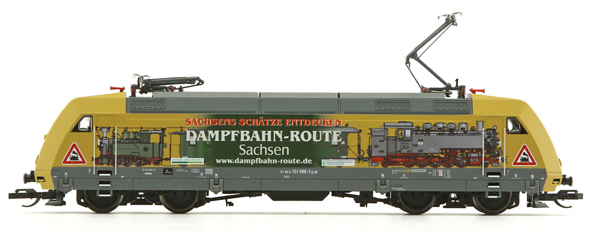 | elektrická lokomotiva s reklamním potiskem „Dampfbahn-Route Sachsen“ |