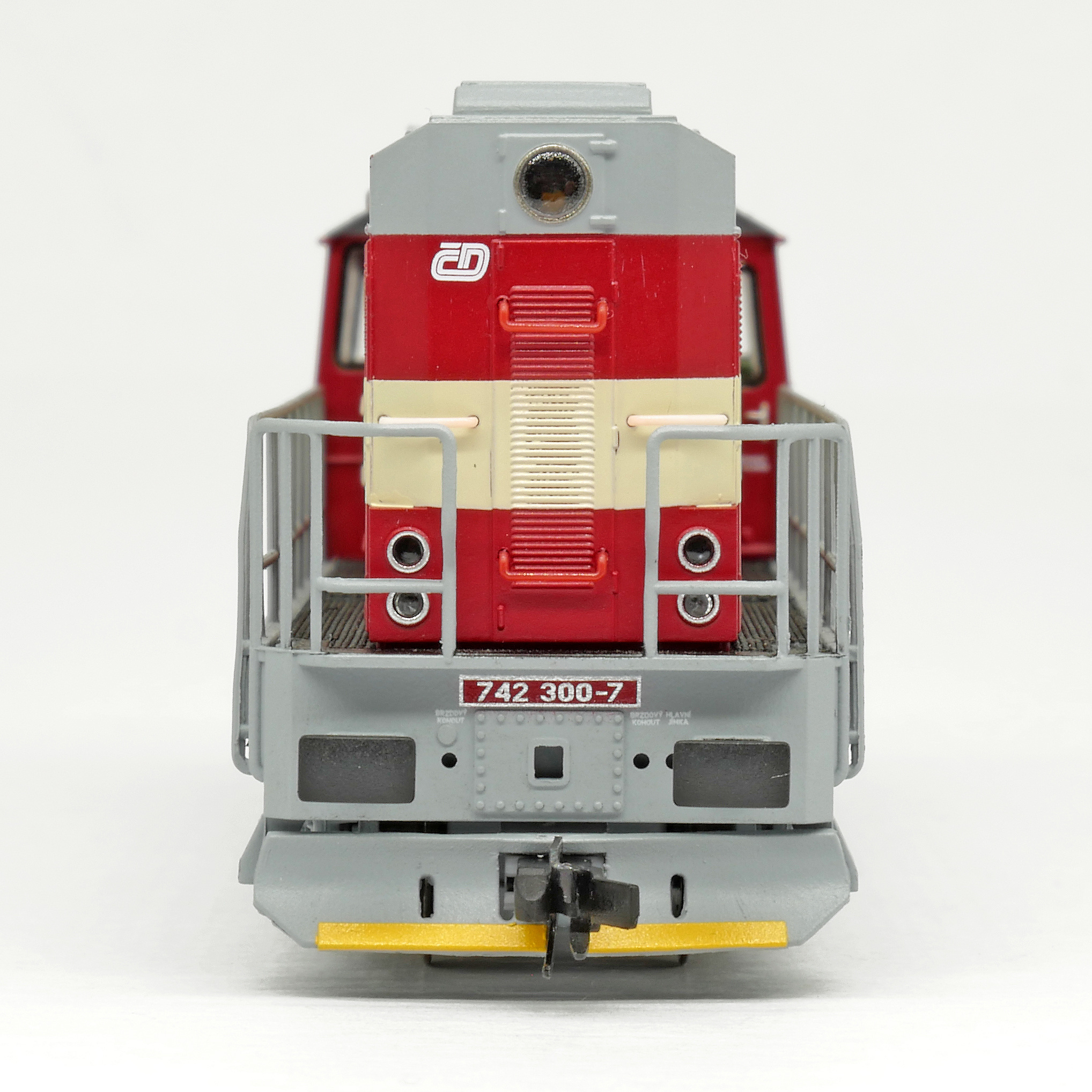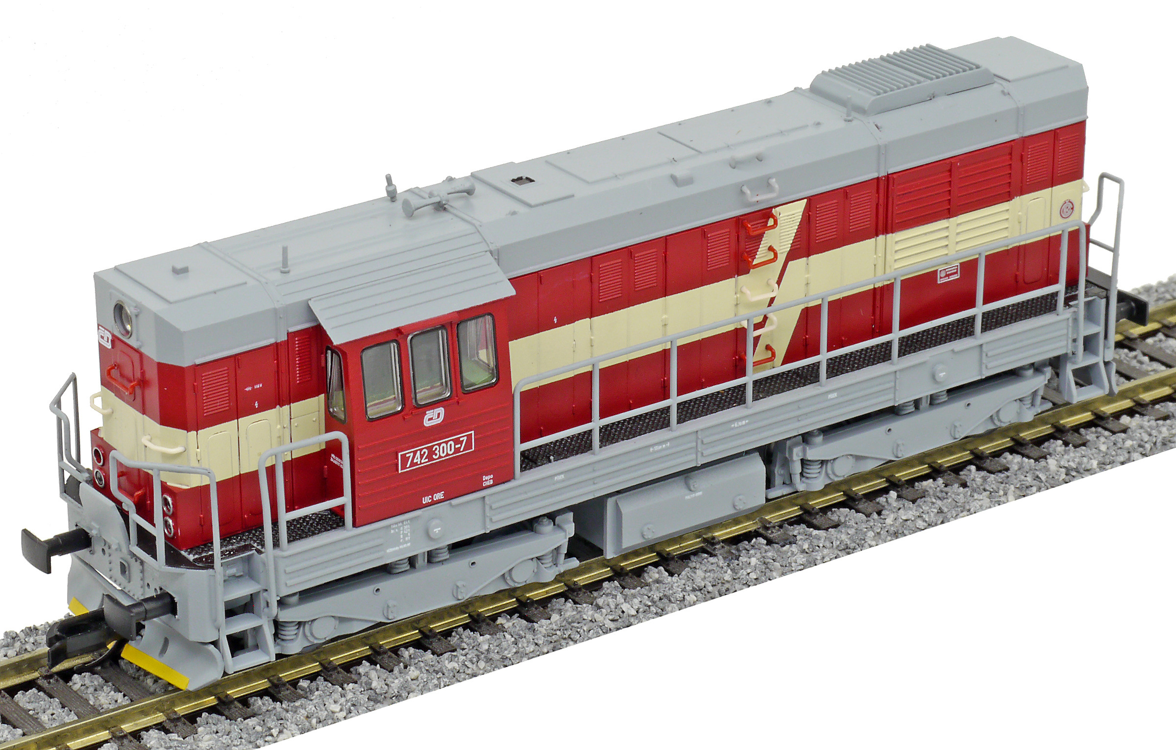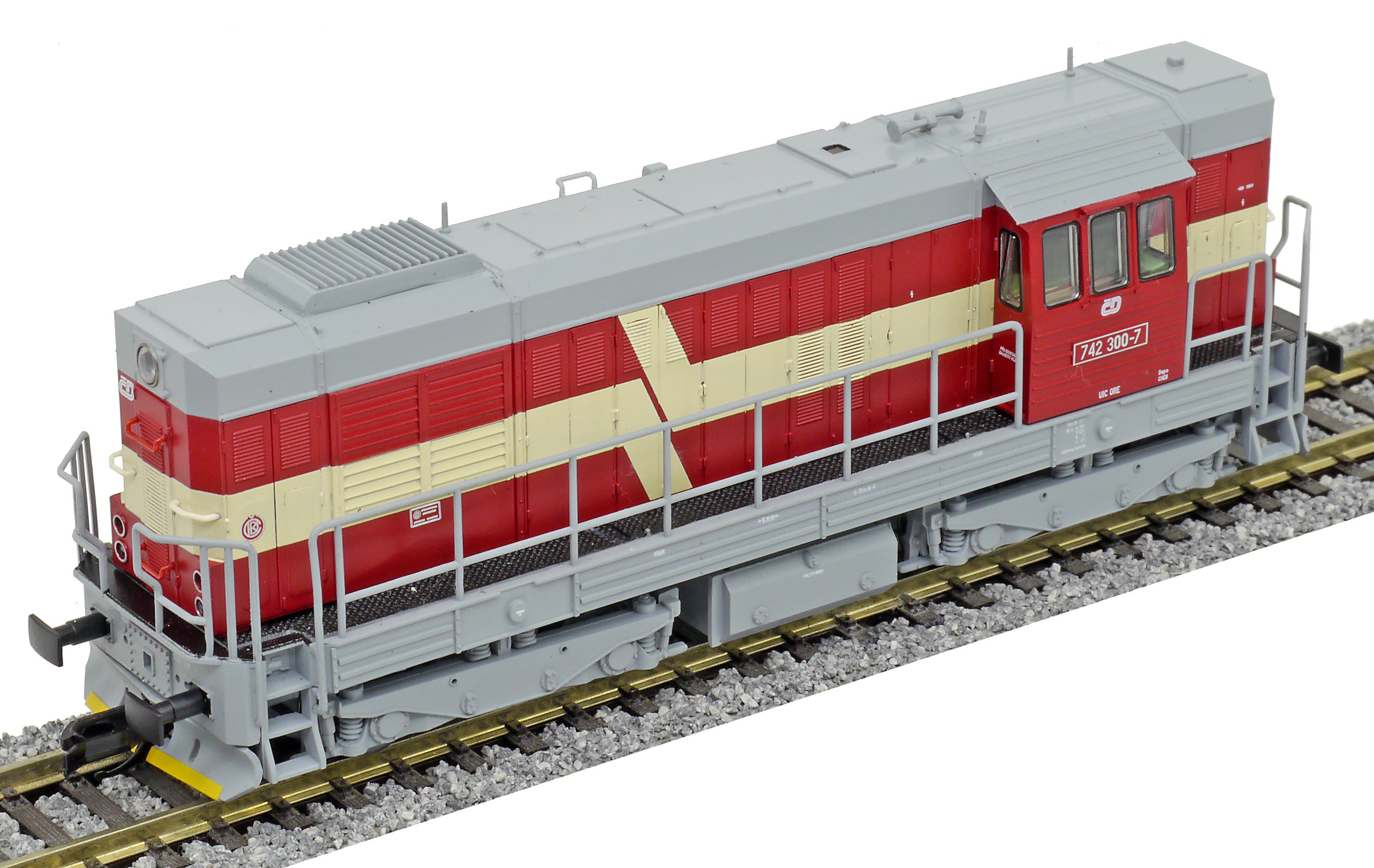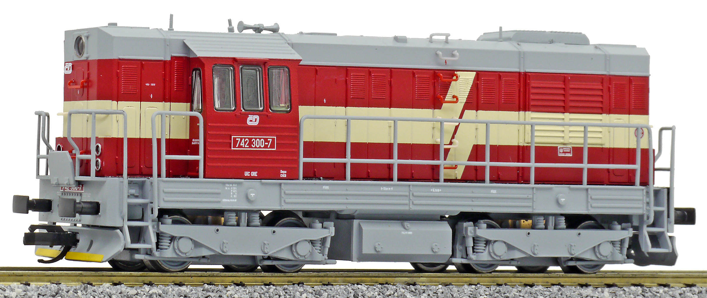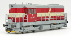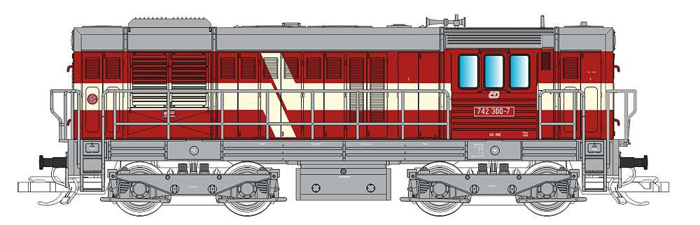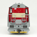 | dieselová lokomotiva červená s krémovým lomeným pásem, šedý pojezd a střecha |