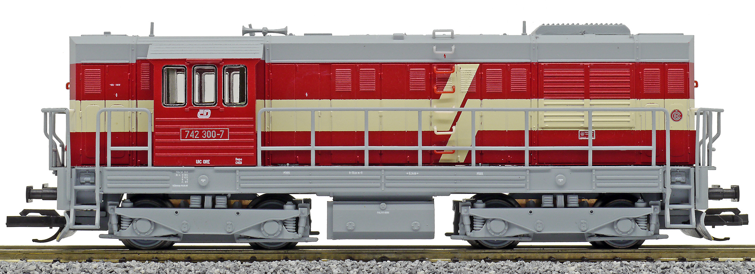 měřítko 1:120 - rozchod kolejí 12 mm osvětlení - 3 reflektory vpředu, 2 světla vzadu, přepínatelné podle směru jízdy 4 hnané nápravy 2 bandážované nápravy kinematika krátkého spřáhla (KKK) podle normy NEM 358 digitální rozhraní podle NEM 662 s konektorem Next18 113 mm - celková délka modelu přes nárazníky 4 - celkový počet náprav nebo rozložení náprav 150 g - hmotnost brutto - model včetně prodejního obalu