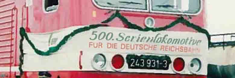 | elektrická lokomotiva červená s transparentem „500. Serienlokomotive für die DEUTSCHE REICHSBAHN“ |