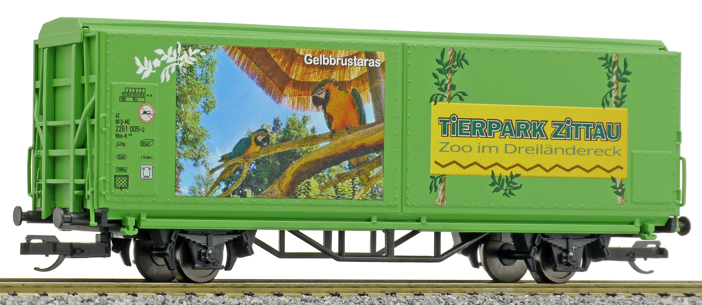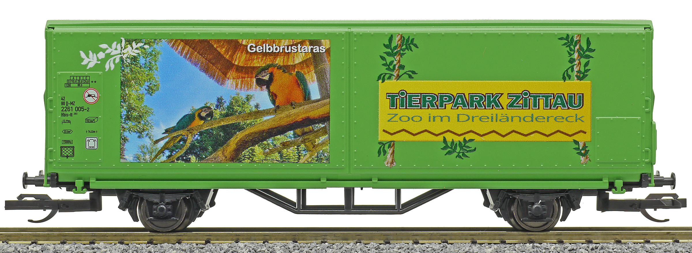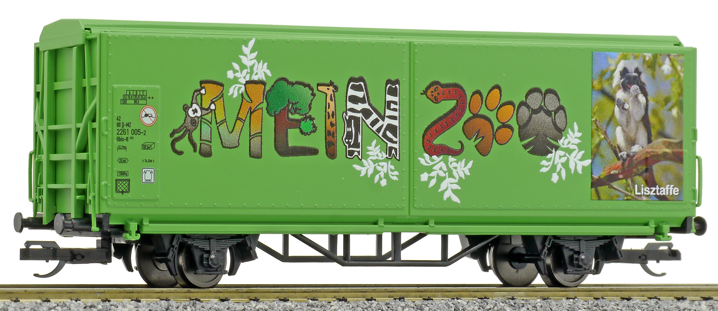 | krytý nákladní vůz s posuvnými stěnami a s reklamním potiskem „Mein Zoo” |
