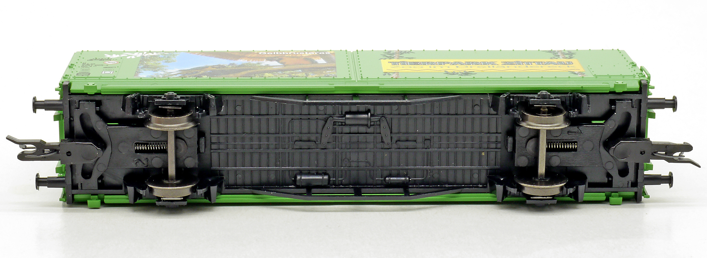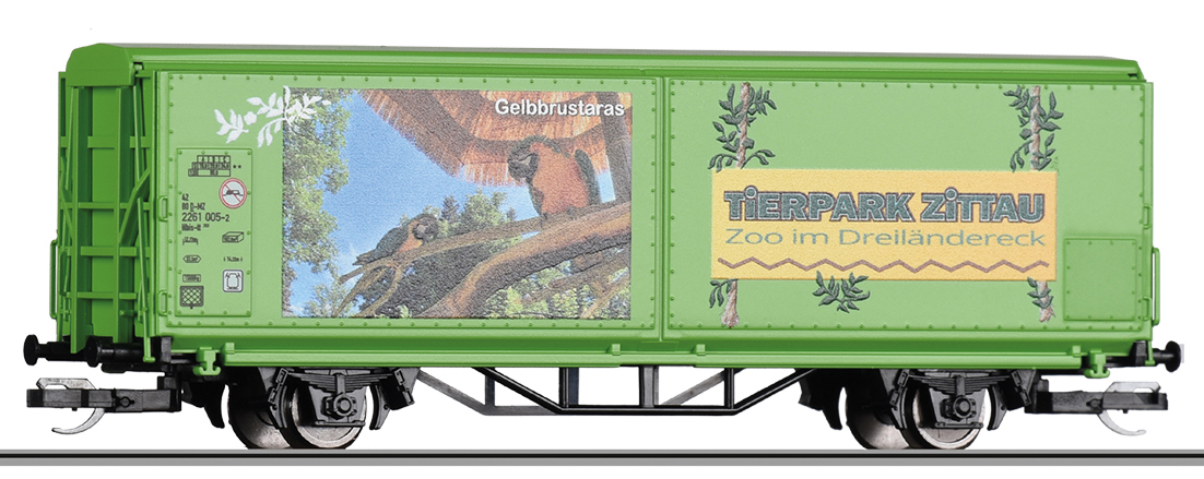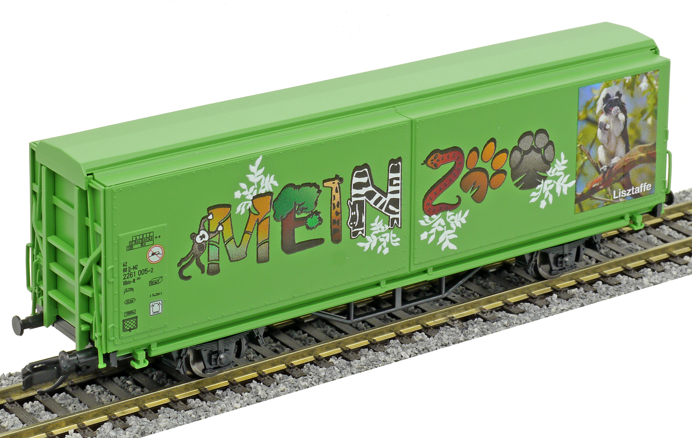 | krytý nákladní vůz s posuvnými stěnami a s reklamním potiskem „Mein Zoo” |