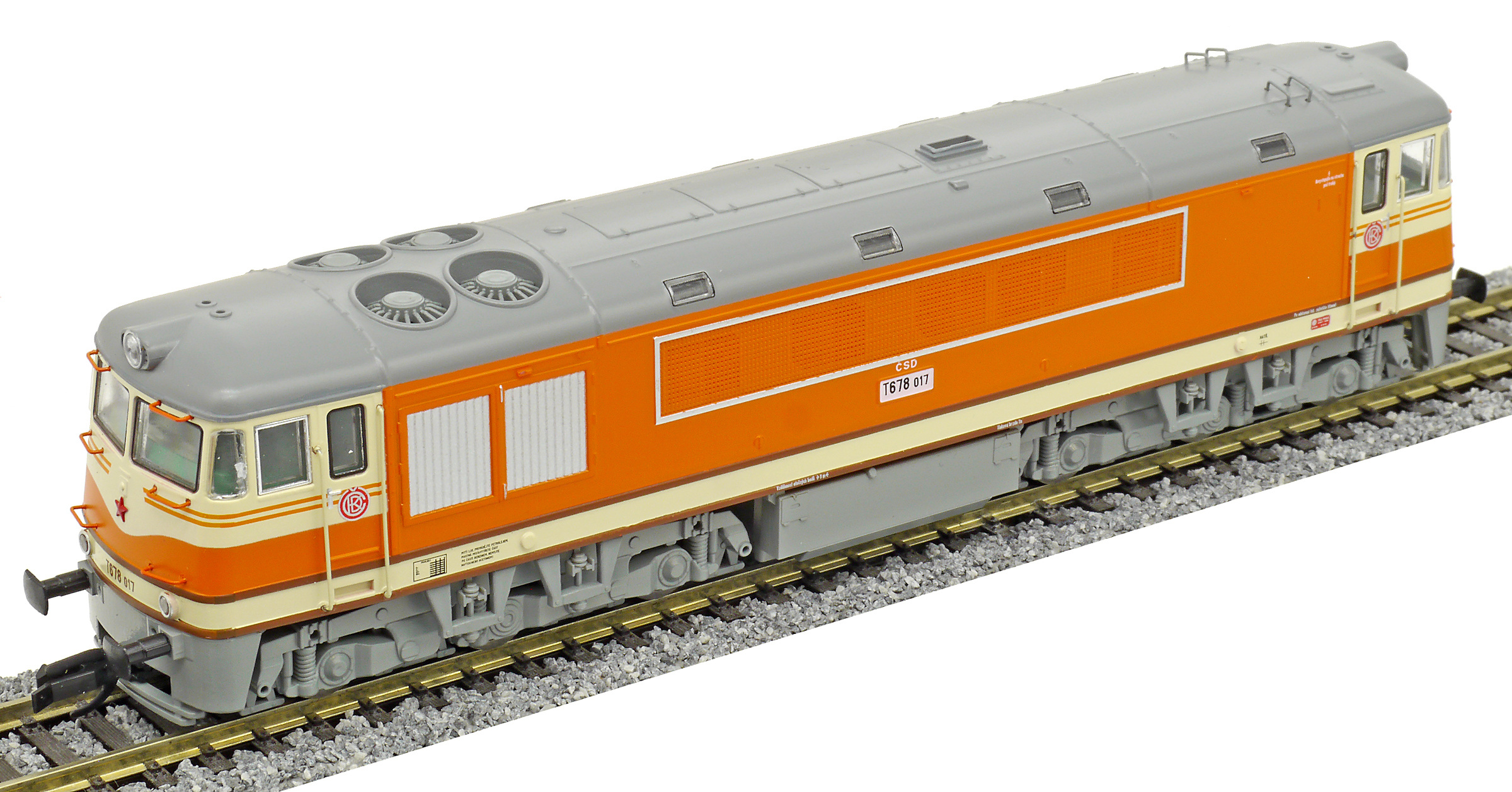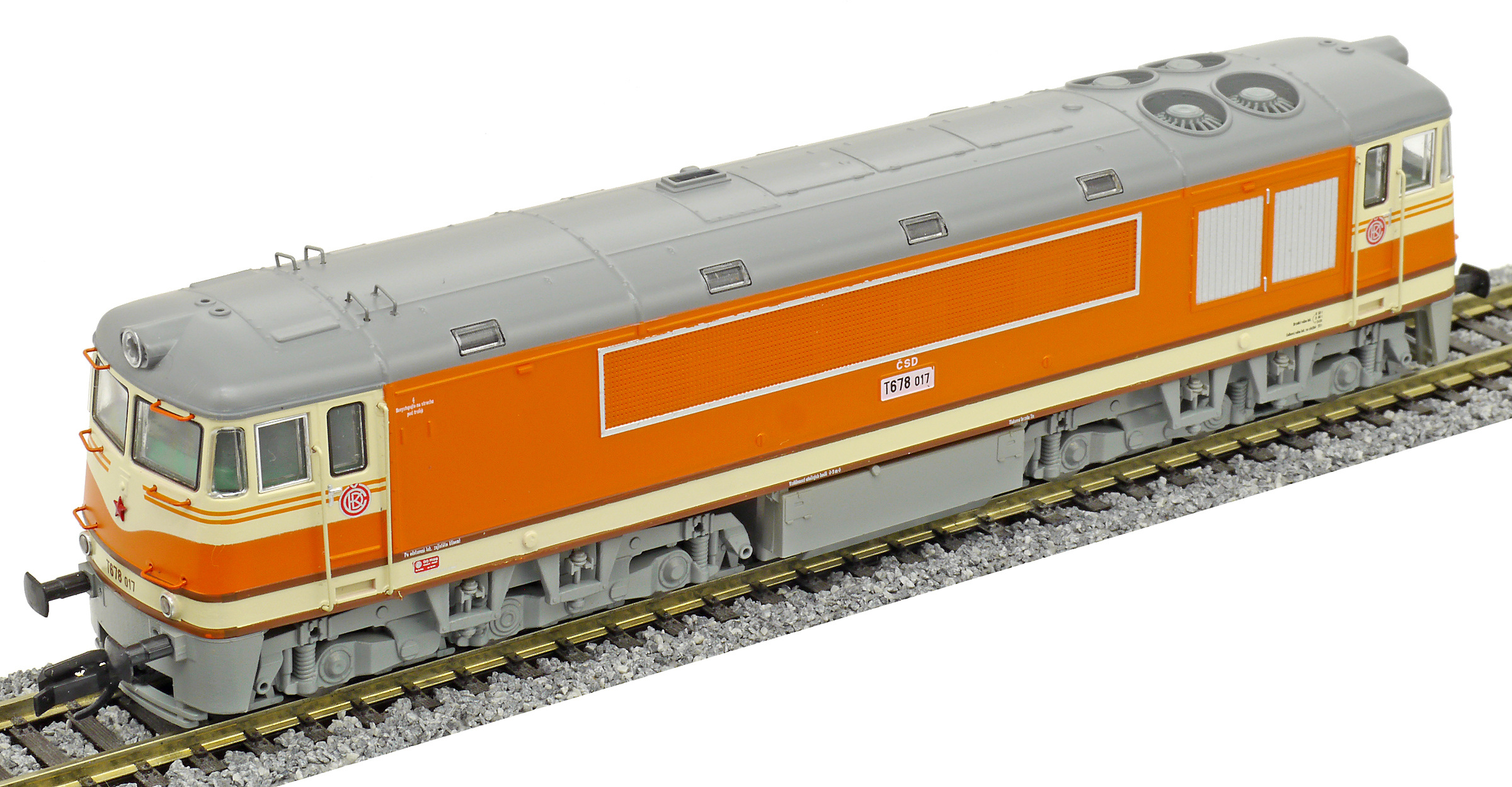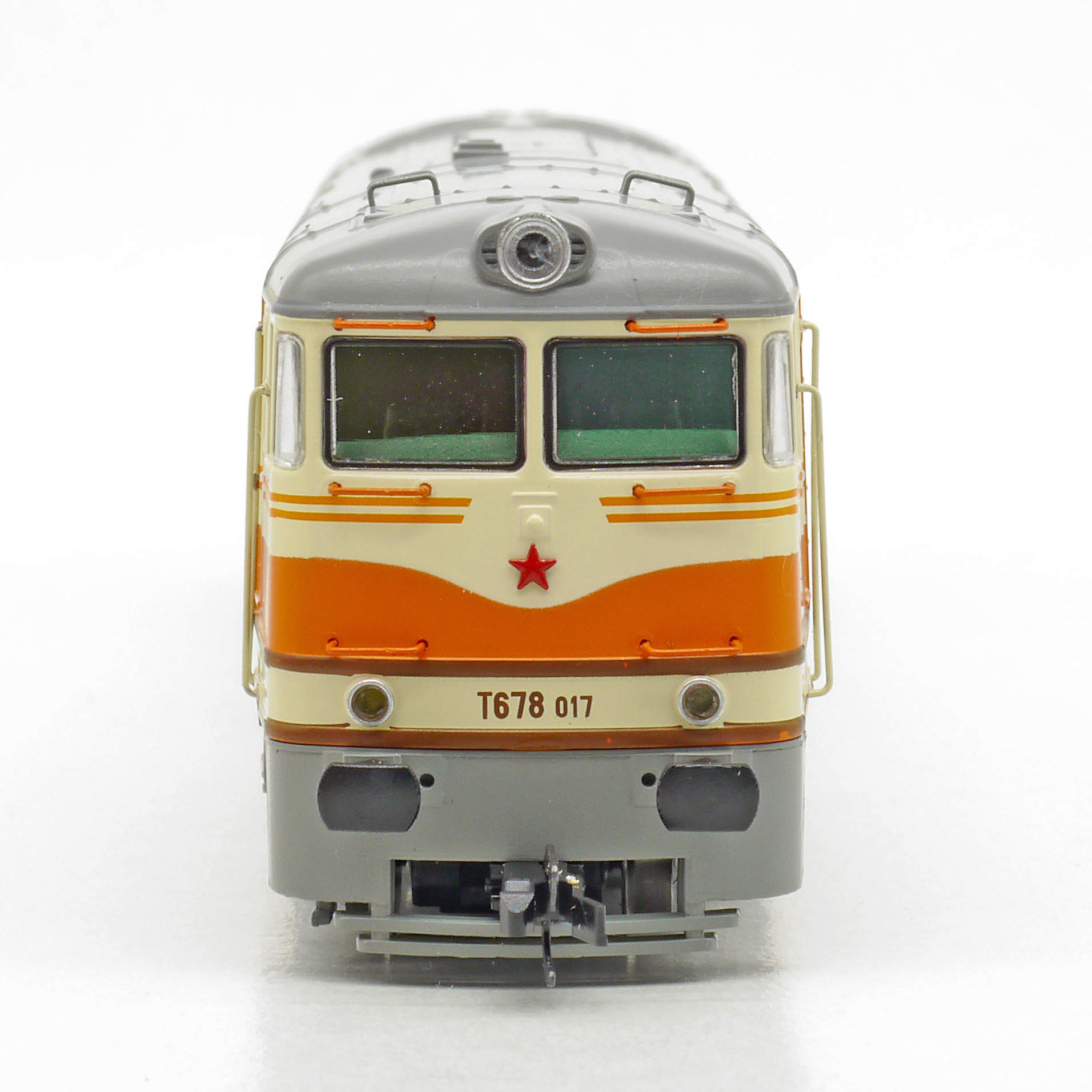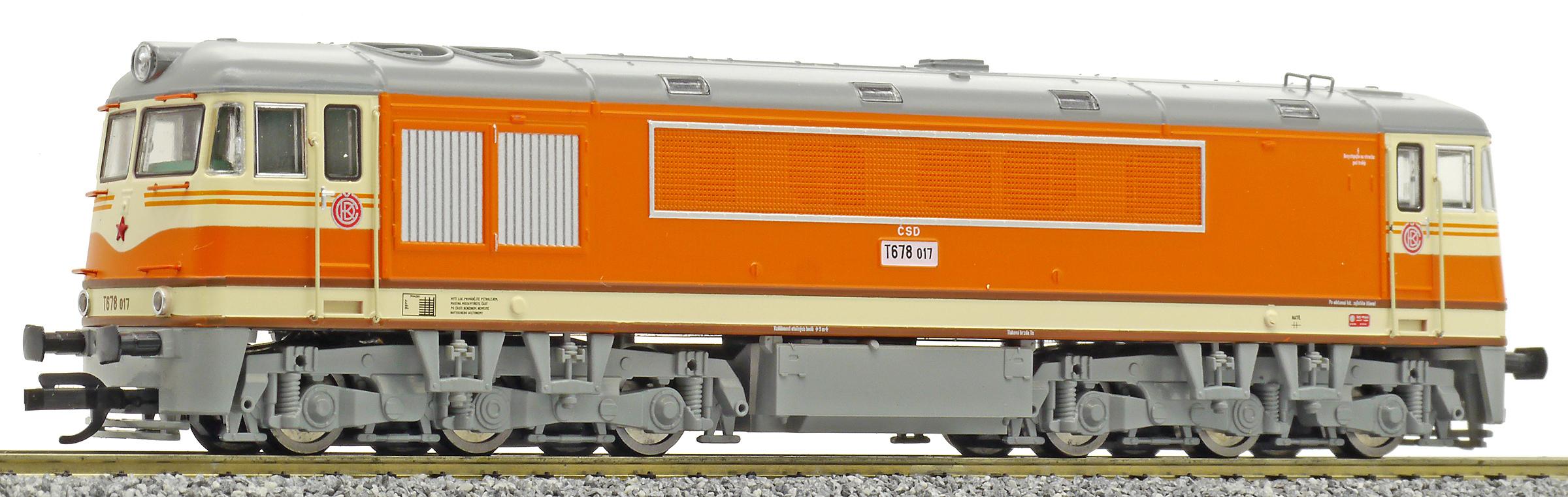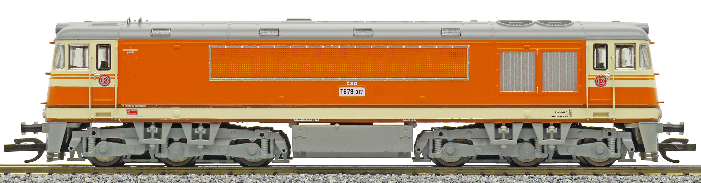 | dieselová lokomotiva oranžová-slonová kost, šedá střecha a pojezd |