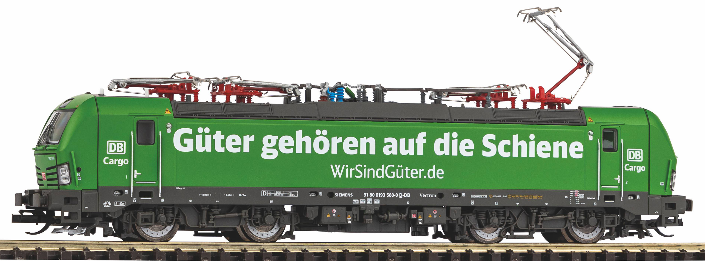| elektrická lokomotiva zelená s potiskem „Güter gehören auf die Schiene“ |