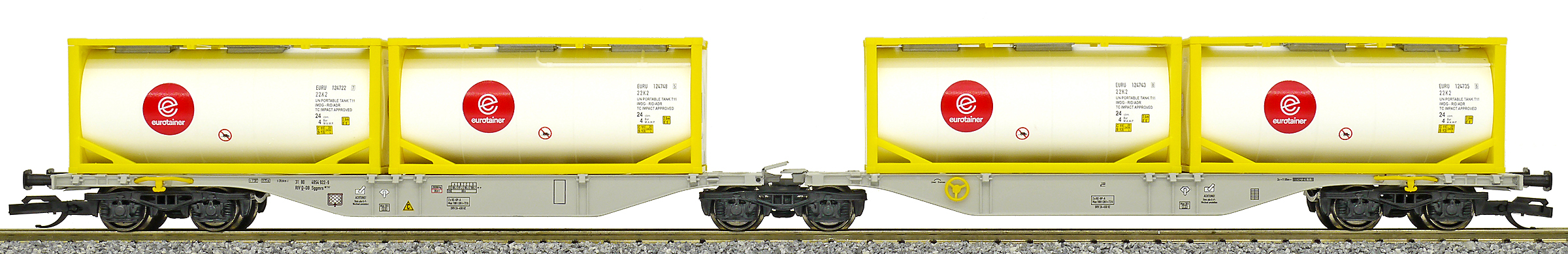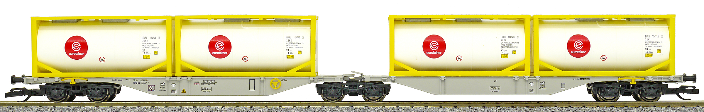 | dvoudílný kontejnerový vůz šedý se čtyřmi tankkontejnery 20' |