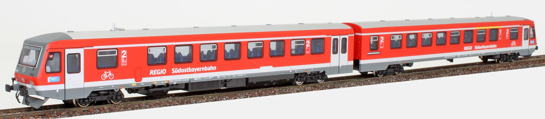 | dvoudální motorová jednotka červená-bílá s šedou střechou „Südostbayernbahn“ |
