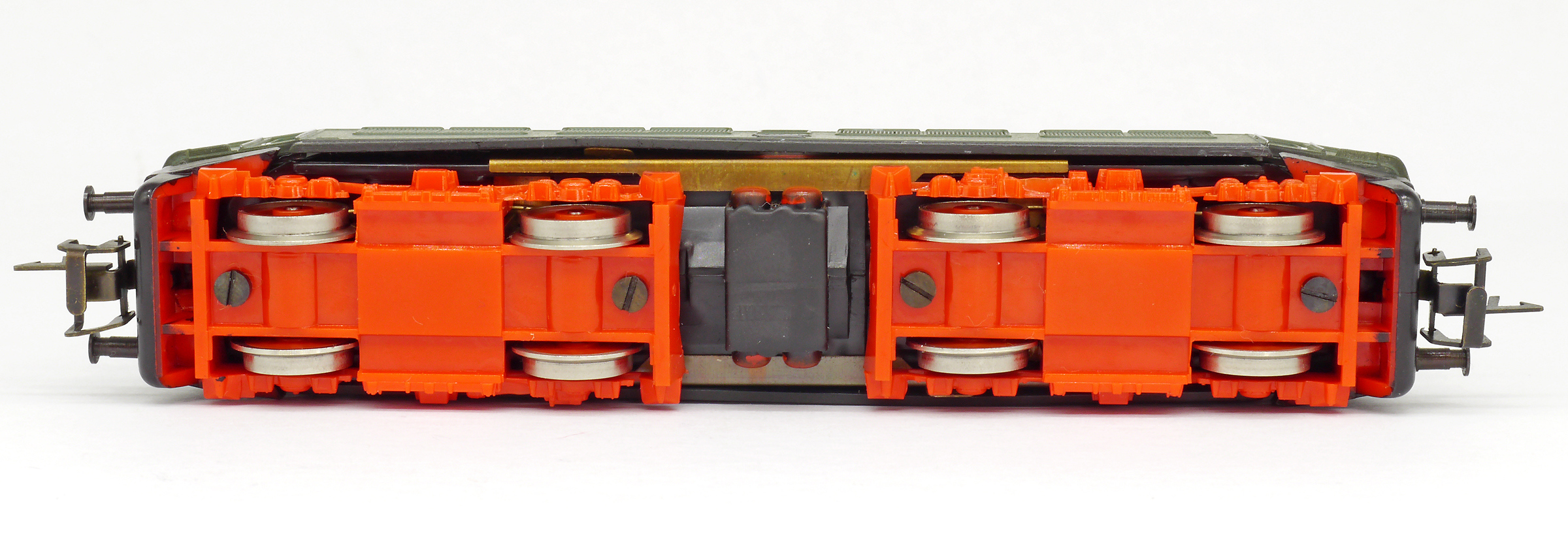 | elektrická lokomotiva zelená s černým rámem, šedou střechou a červenými podvozky |