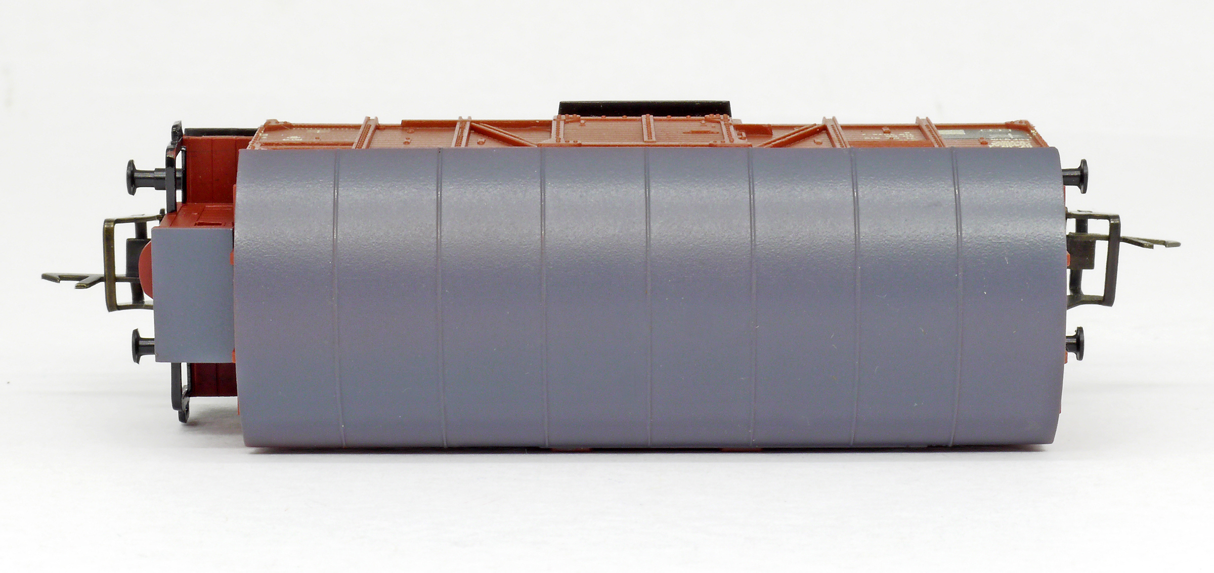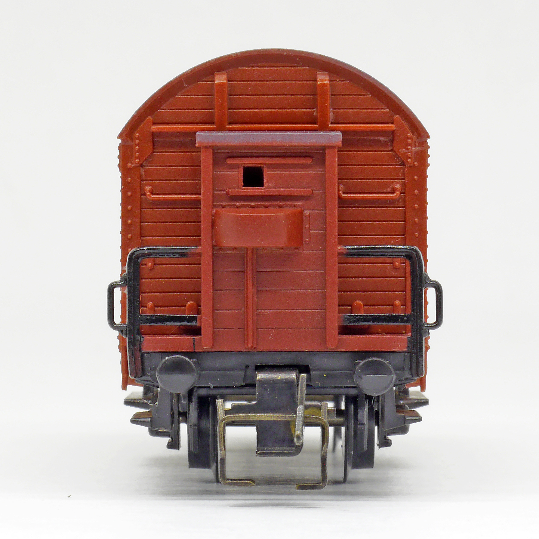 | krytý nákladní vůz červenohnědý s černou střechou a s brzdařskou budkou |