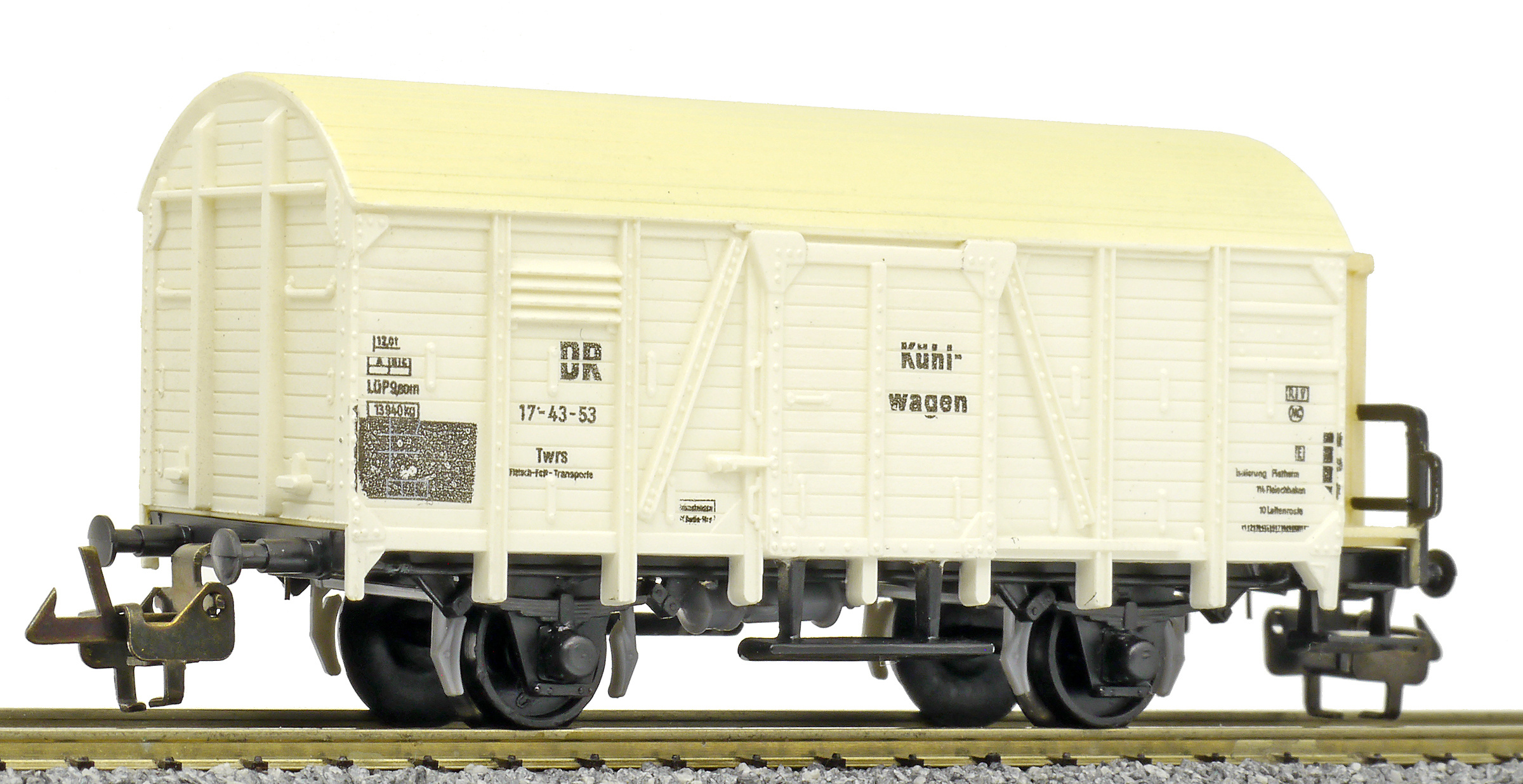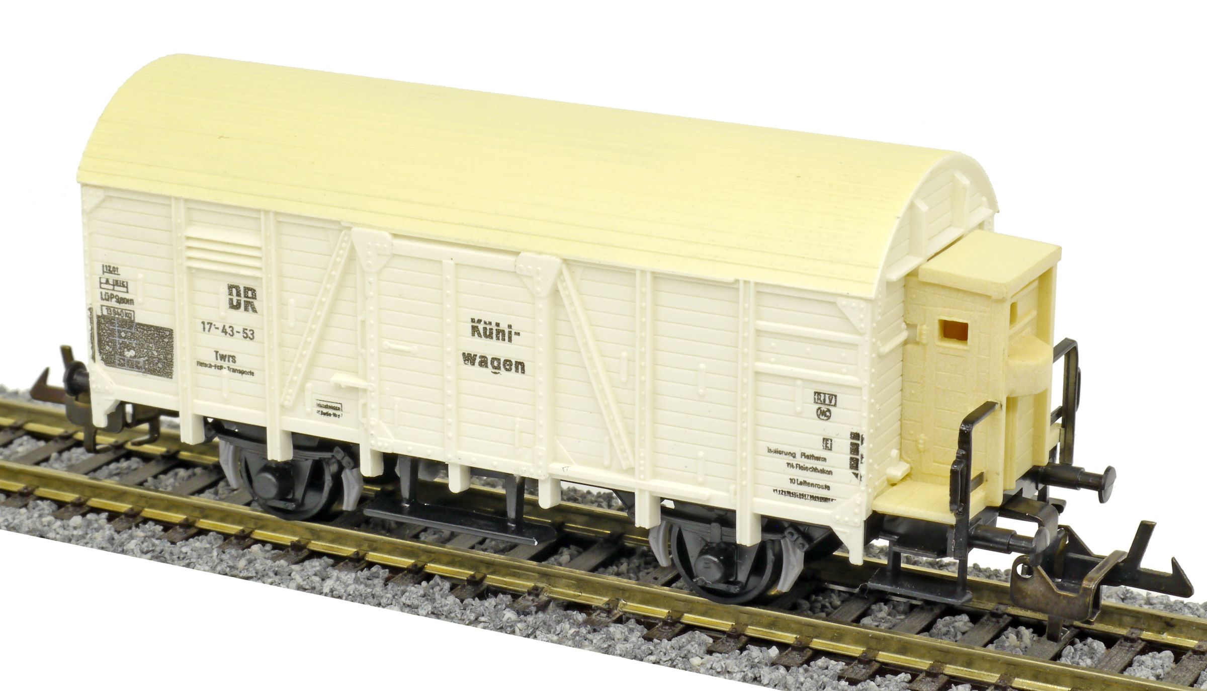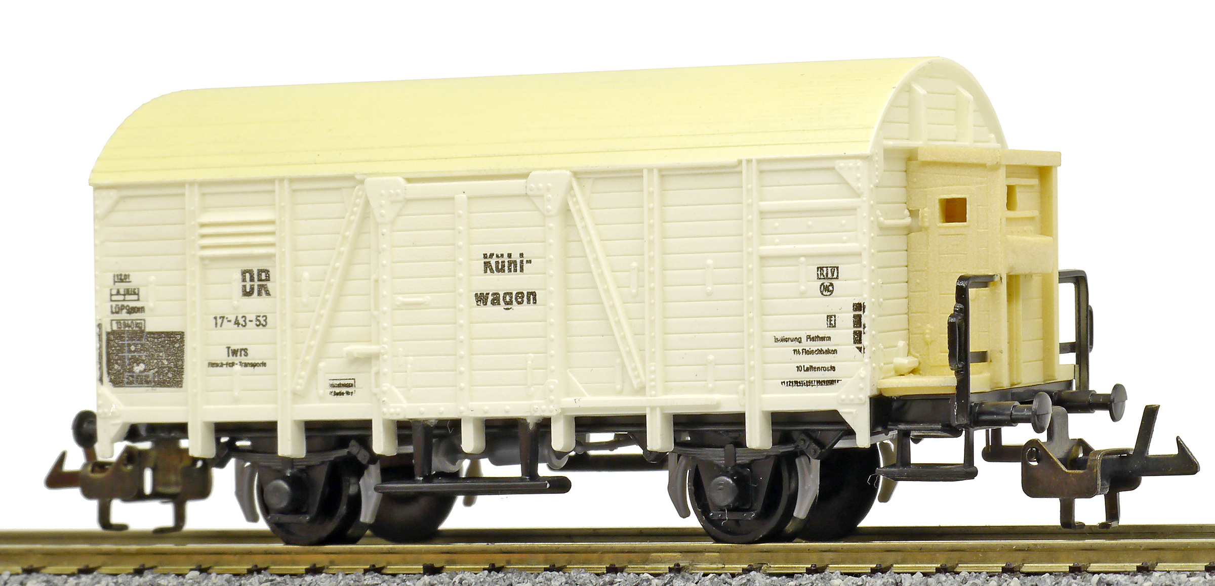 nákladní chladící vůz bílý s krémovou střechou „Kühlwagen“ a s brzdařskou budkou