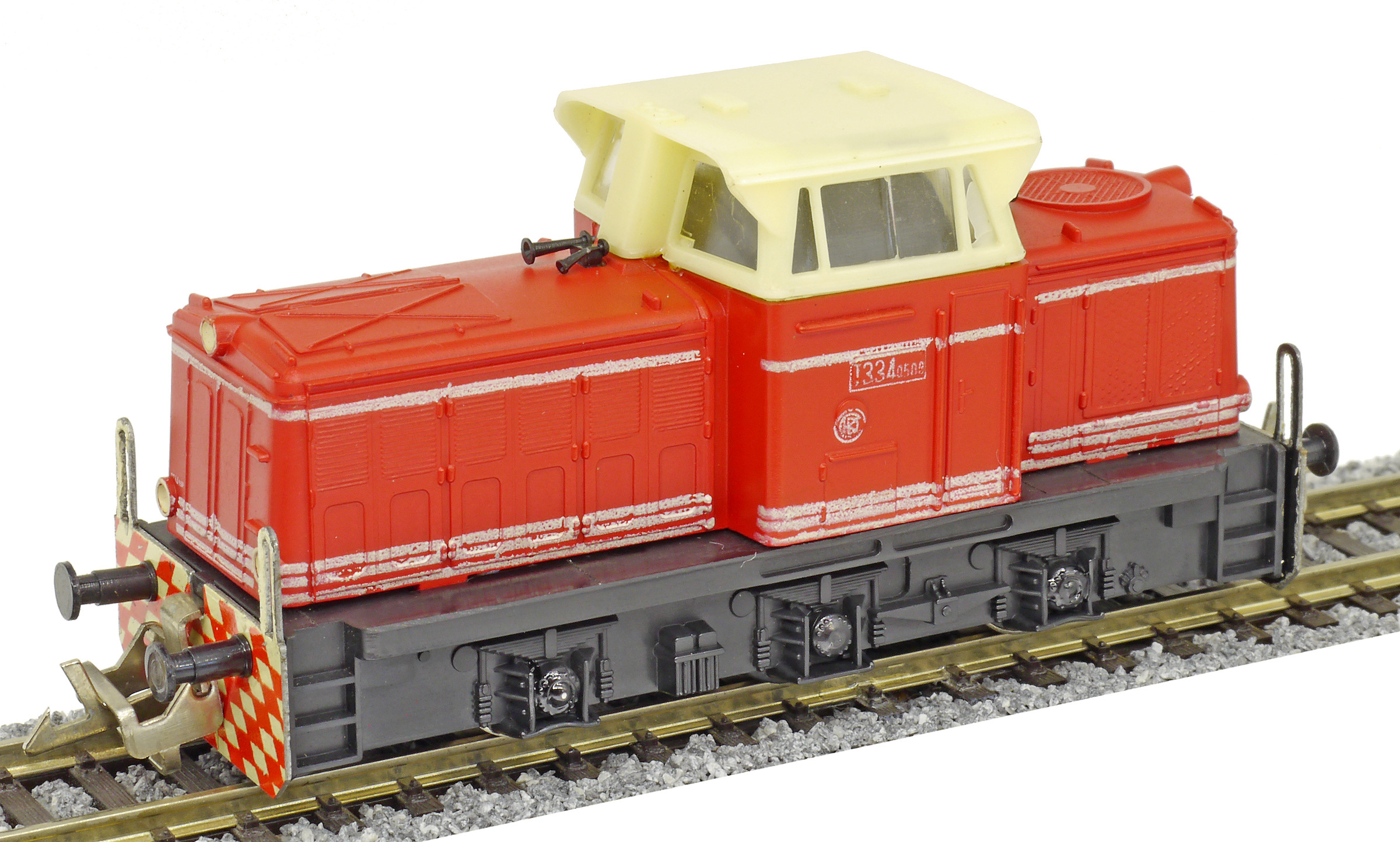 | dieselová lokomotiva červená s bílými proužky, krémová budka, černý rám a pojezd |