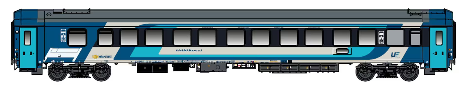 | lůžkový vůz v barevném motivu modré-šedé s šedou střechou |
