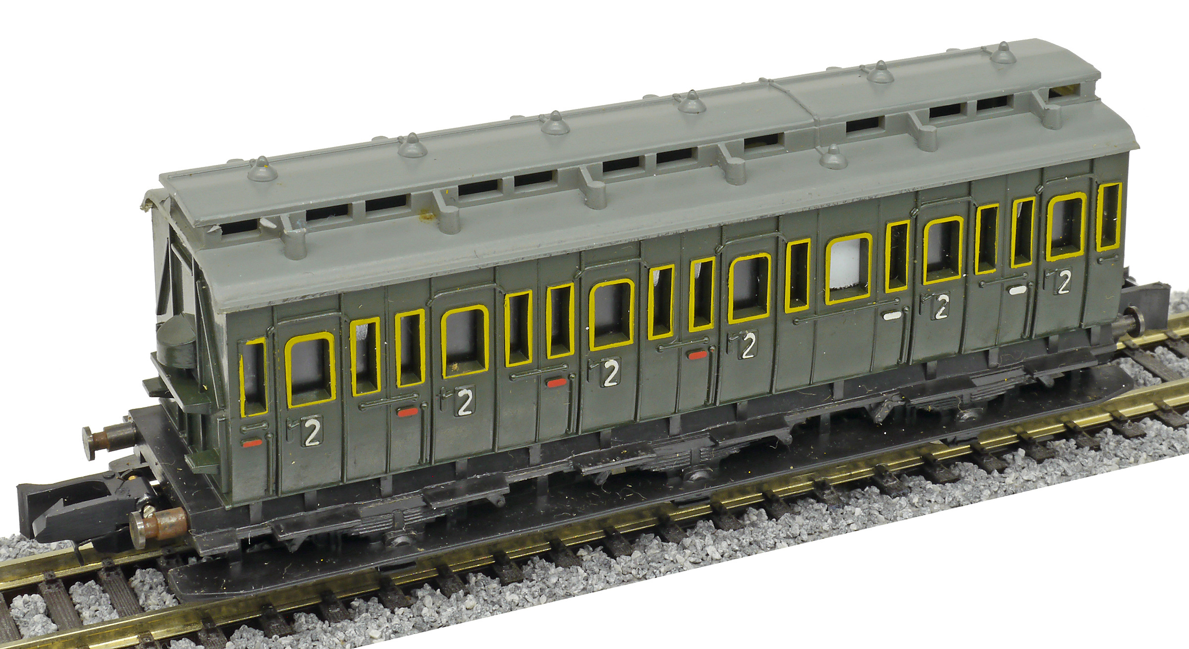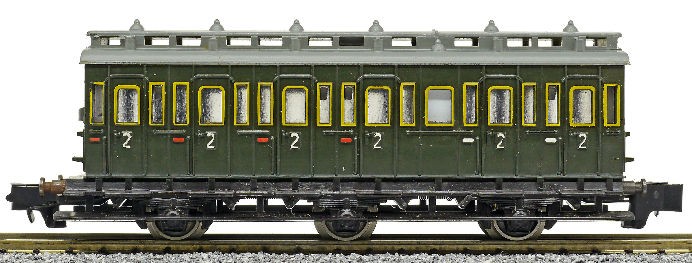 | oddílový osobní vůz zelený s šedou střechou 2. tř. |