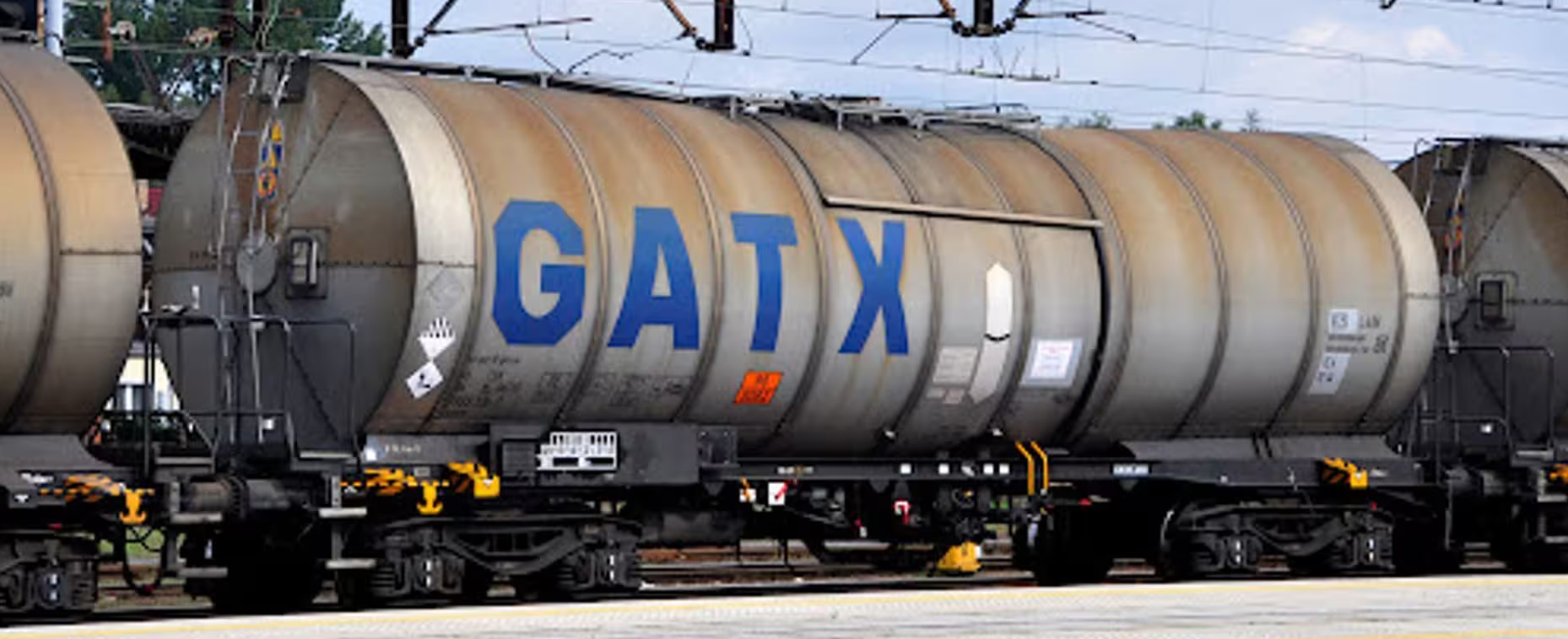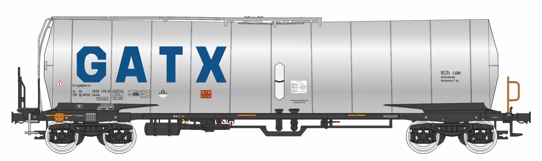 | kotlový vůz šedý s velkým modrým logem „GATX“ |