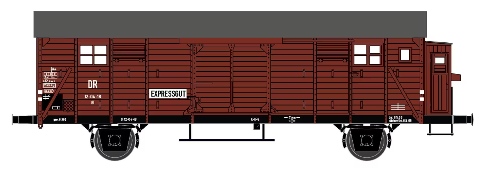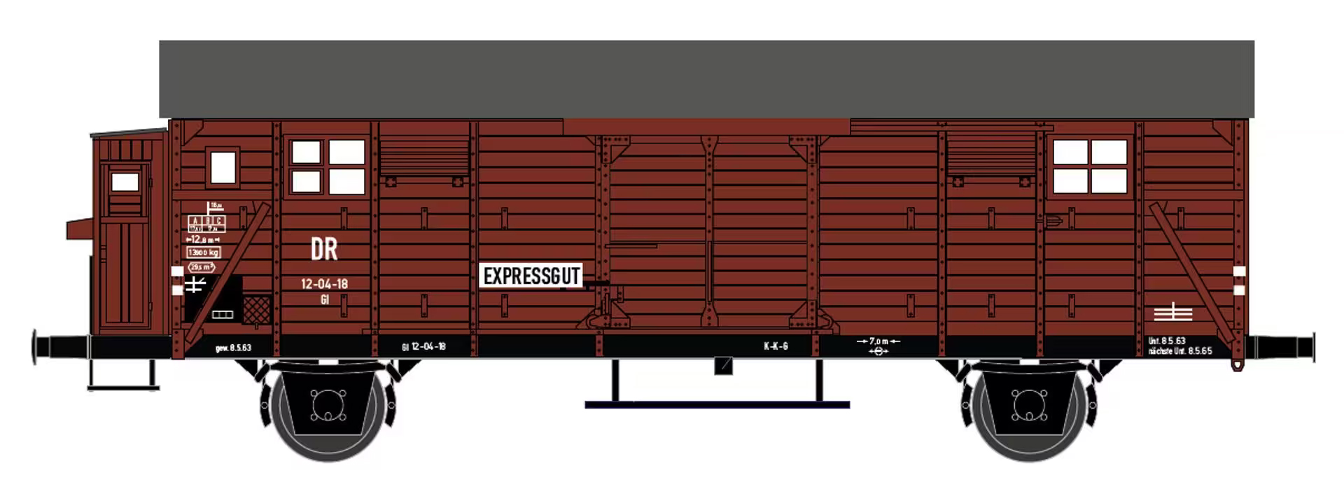 | krytý nákladní vůz červenohnědý s šedou střechou a s brzdařskou budkou „EXPRESSGUT“ |