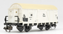 | nákladní chladící vůz bílý s krémovou střechou a s brzdařskou budkou na přepravu ryb „Seefische“ |