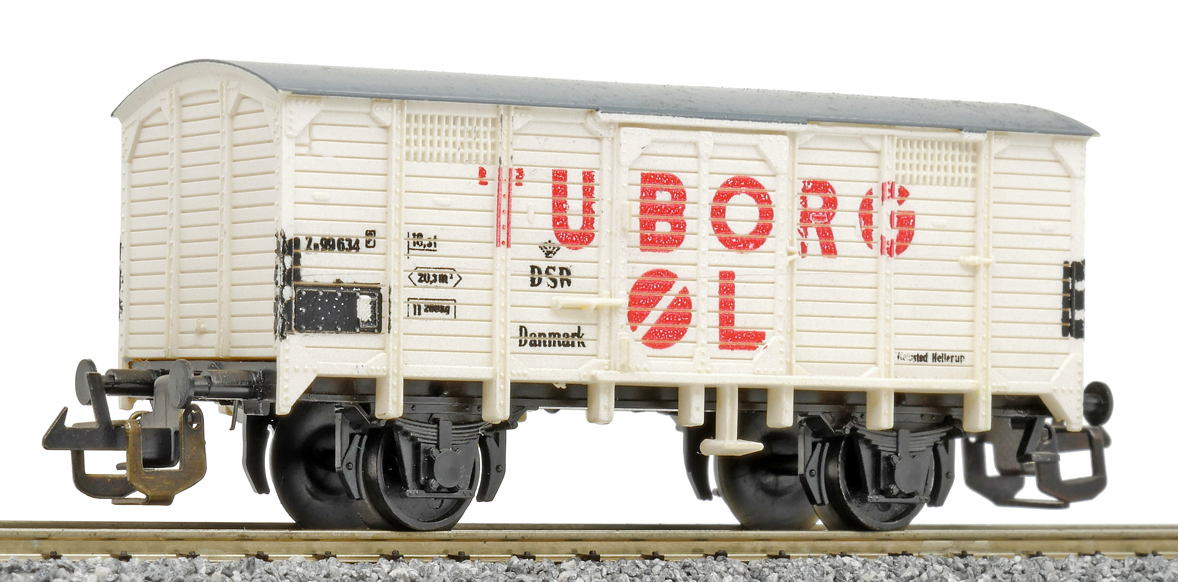 | krytý nákladní vůz bílý s šedou střechou „TUBORG ØL“ |