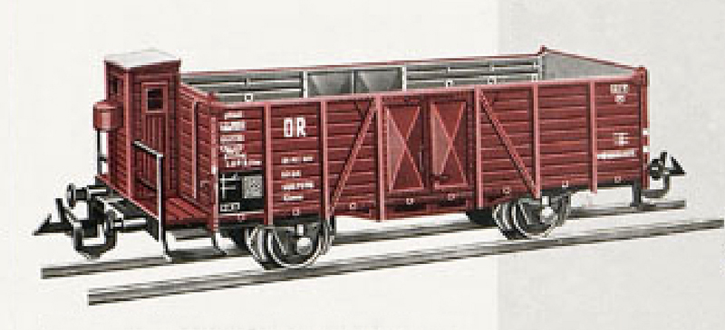 | otevřený nákladní vůz červenohnědý s brzdařskou budkou |