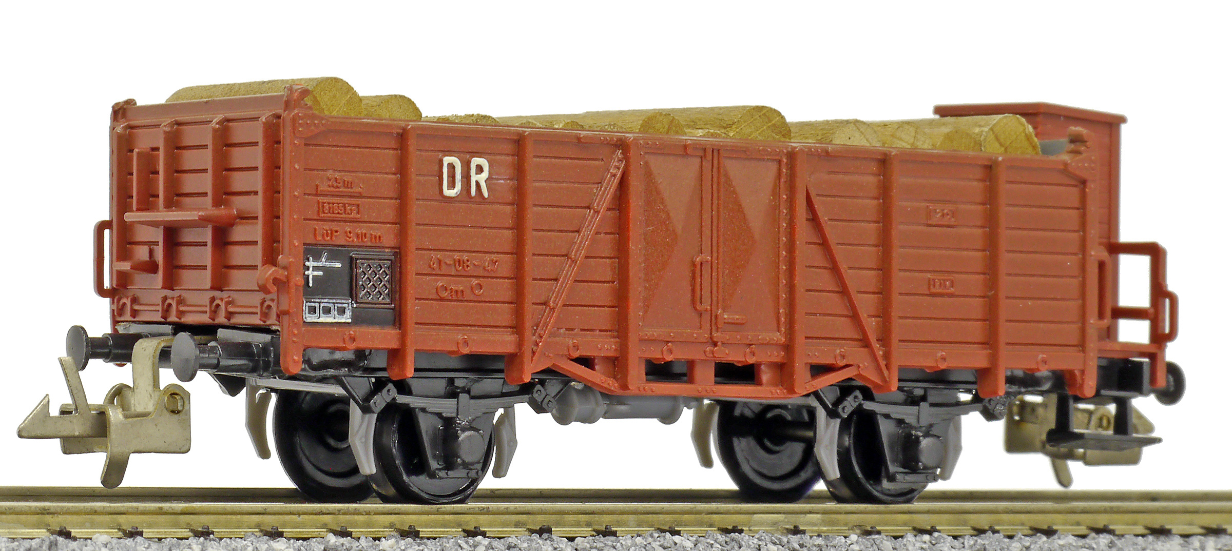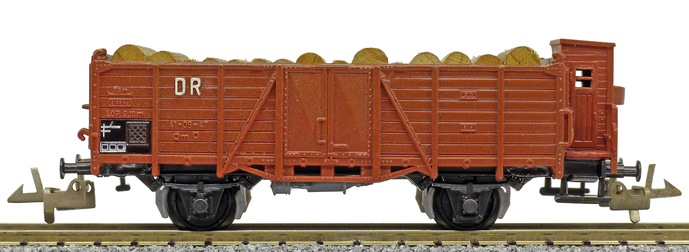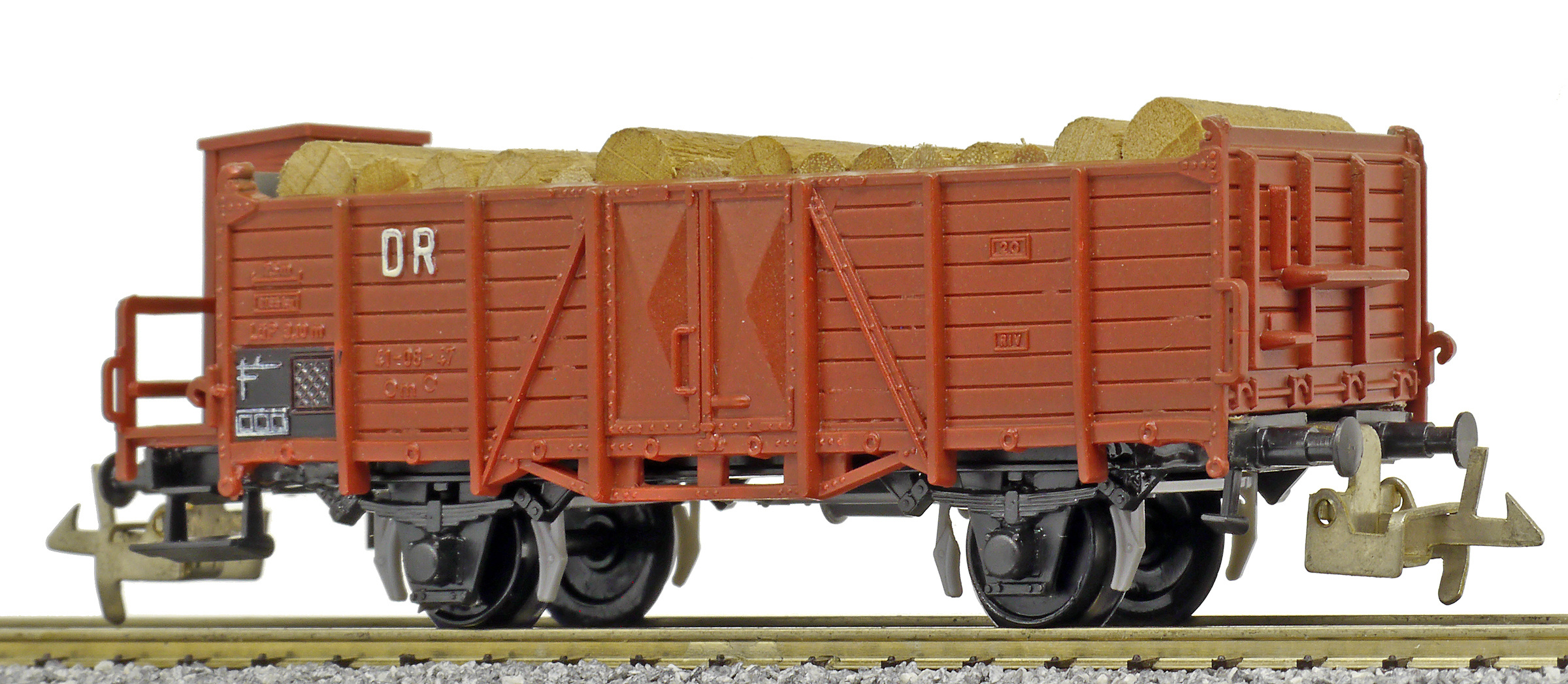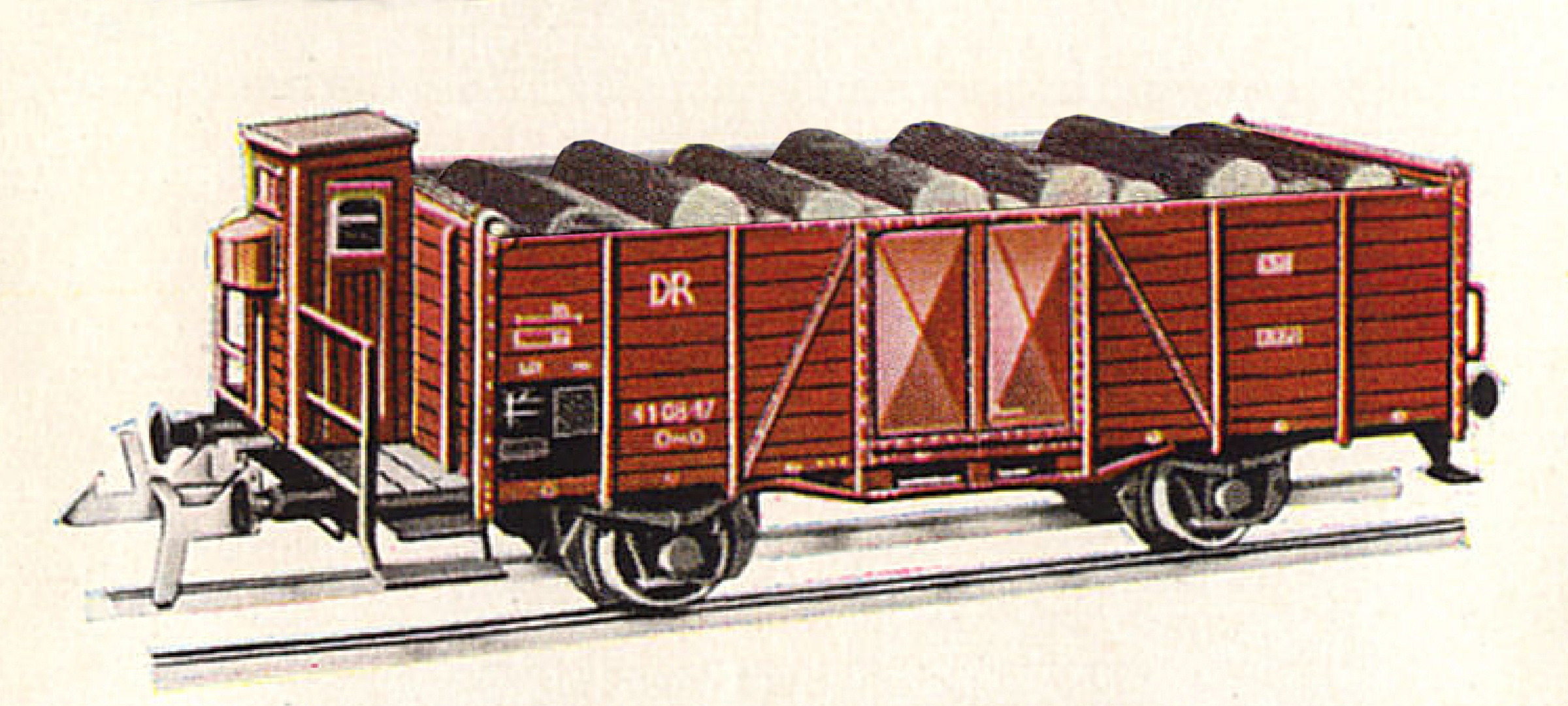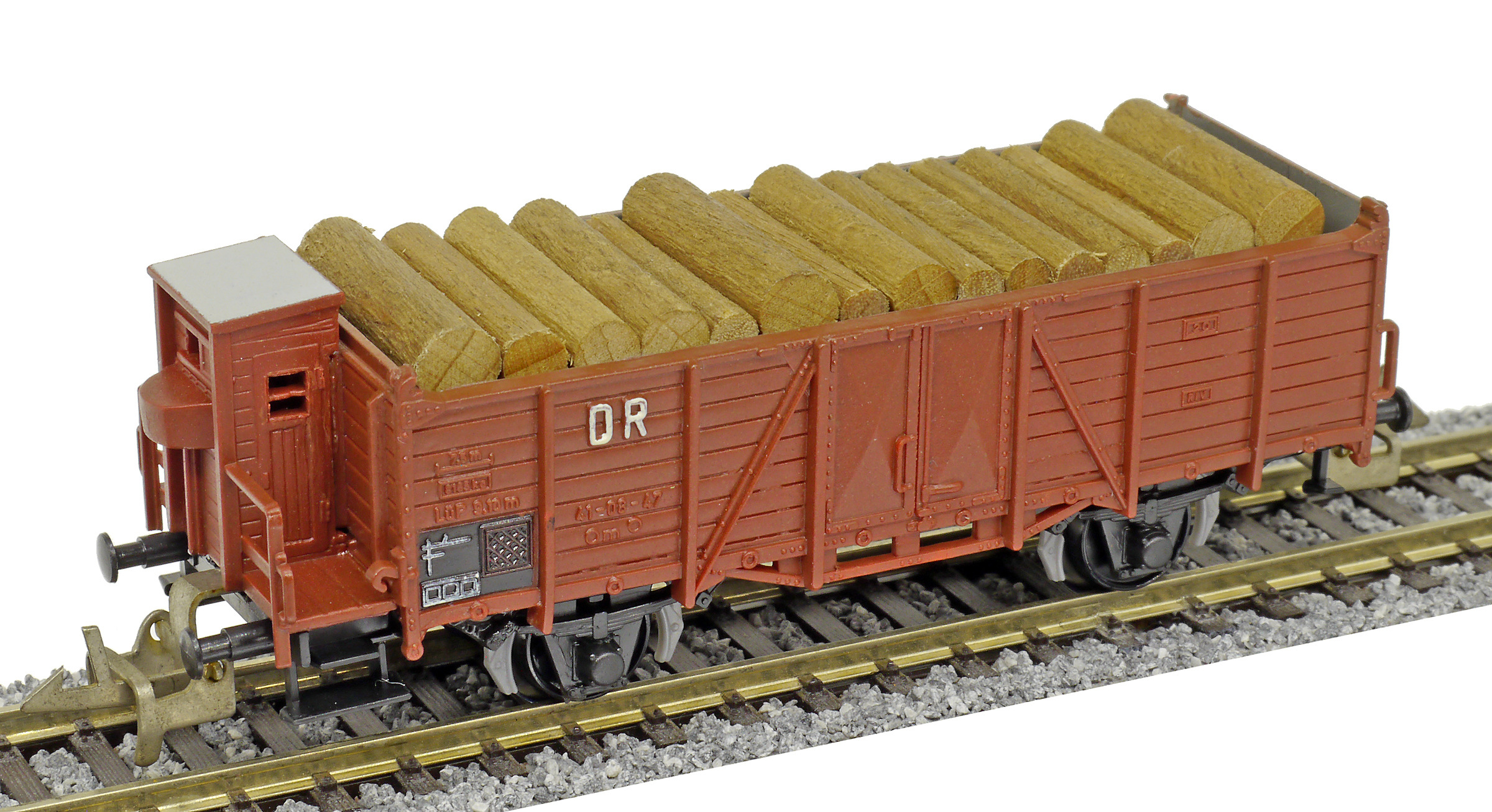 | otevřený nákladní vůz červenohnědý s brzdařskou budkou ložený kulatinou |
