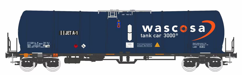 | kotlový vůz tmavě modrý se dvěma brzdařskými plošinami a s logem „wascosa“ |